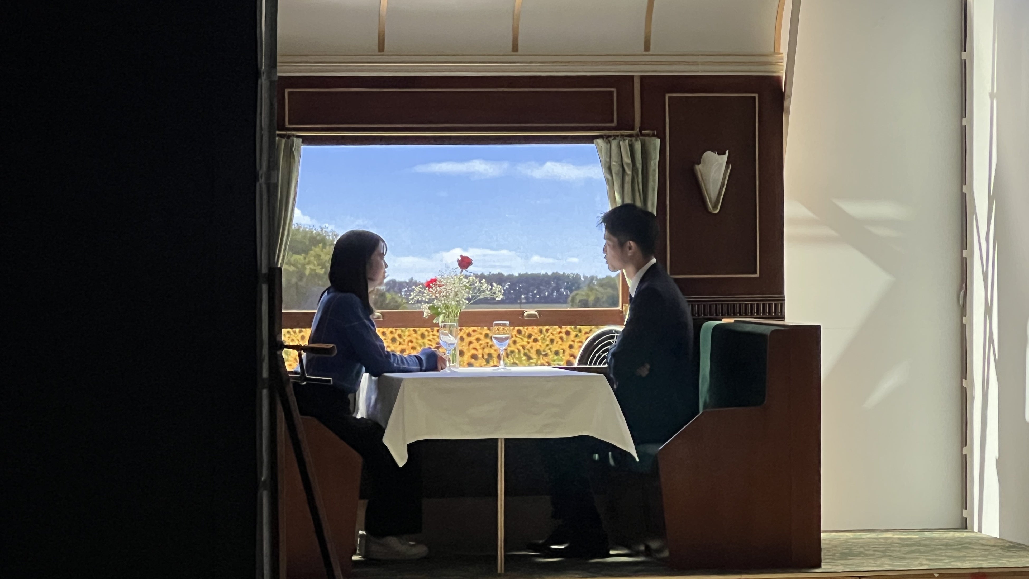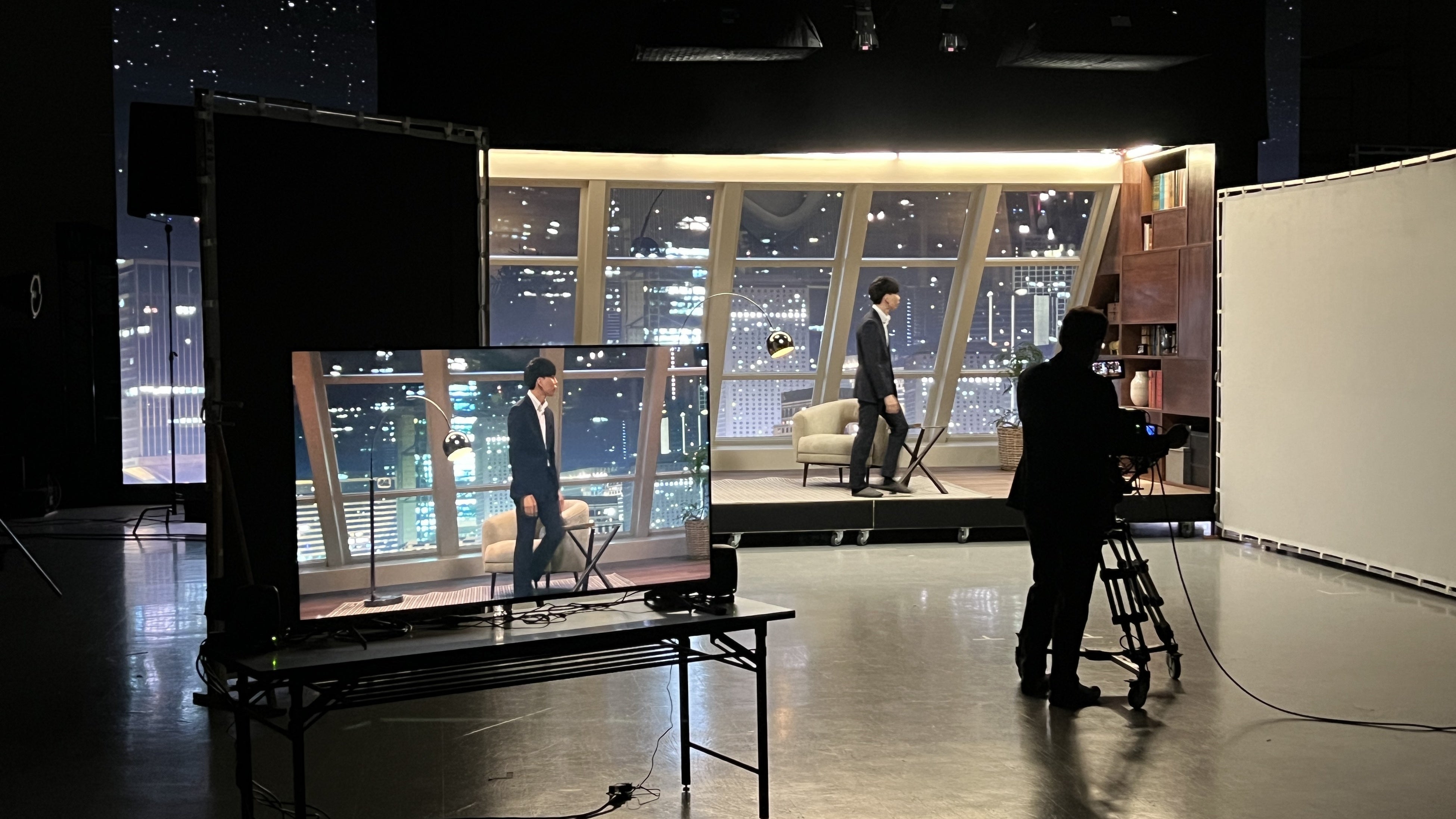※注 大型 LED ディスプレイ、カメラトラッキングとゲームエンジンを組み合わせた撮影手法のひとつ。主に 3DCG で作成した背景(バーチャル背景)を大型ディスプレイに表示し、その手前に実際のオブジェクトや人物を配置してカメラで再撮影することで、背景に映し出された場所で実際に撮影したかのような映像を制作する技術。