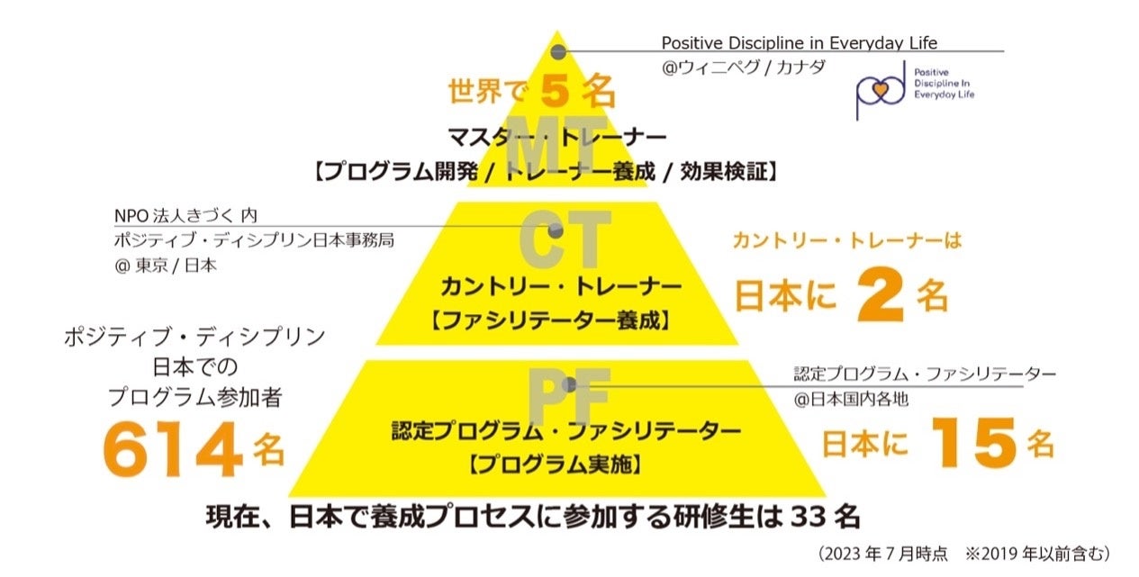 世界各国で推進されるポジの普及モデルは、プログラム開発者のマスター・トレーナー(MT)が各国にCTを養成し、その認定を受けたCTのみがプログラム実施を担うPFを養成する仕組みとなっています。 本プロジェクトでは、カナダよりMTを招致し、日本で2名の既存の認定CTと協力して、国内のCT候補者6名に対して養成研修を行います。並行して、CT候補者は、MTと既存の認定CTの伴走支援を得ながら、PFを養成します。