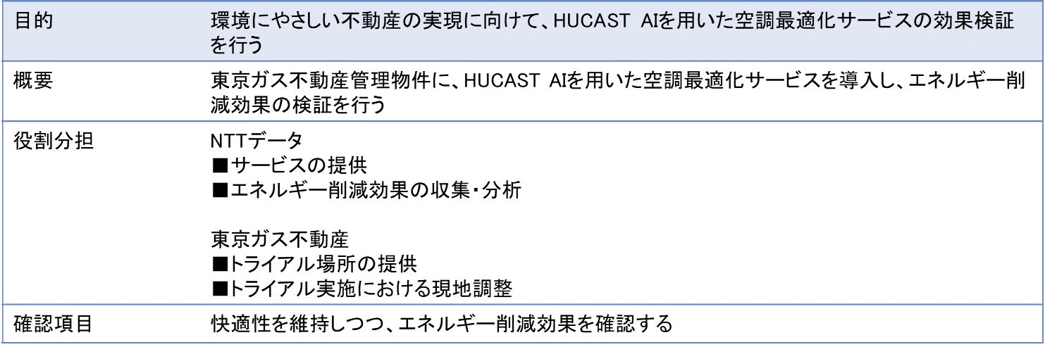 「かけがえのない自然を大切に資源・エネルギーの環境に調和した利用により地域と地球の環境保全を積極的に推進し社会の持続的発展に貢献する」という環境理念を掲げる、日本を代表するエネルギーインフラ事業者である東京ガスグループと、HUCAST AIを用いた空調最適化サービスのトライアルを実施することで、東京ガス不動産が目指す環境にやさしい不動産の実現を支援します。具体的には、ビルの大部分を占める空調エネルギーについて、従来の機器改修ではなく、NTTデータのAIを活用することで初期投資・運用コストを抑え、省エネ化する新たな施策の有効性を実証します。