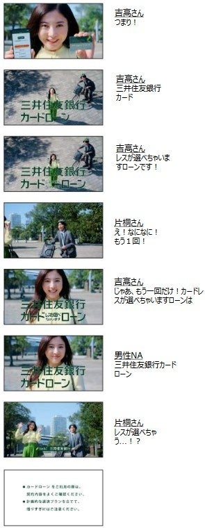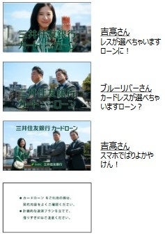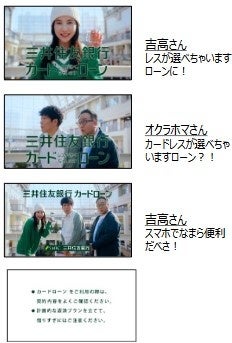 本CMは、「カードローン」という名称にも関わらずカードが無くてもスマホのみで申し込みができるサービス内容を、「三井住友銀行 カードレスが選べちゃいますローン」というキャッチコピーでコミカルに表現する内容となっています。