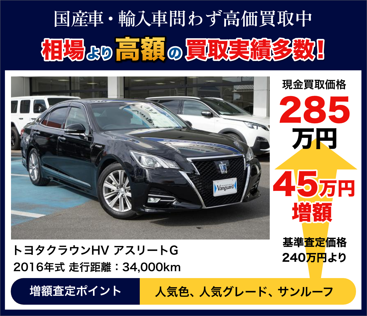 中古車の無料査定依頼がスマートフォンやパソコンで簡単に申込。バンガード車買取の強みである人気色・人気グレード・オプションなどのプラス査定や高価買取の理由をわかりやすく説明