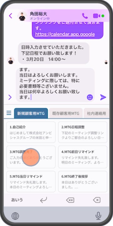 スマホのキーボードに定型文・資料・画像など利用頻度の高いコンテンツを登録することでワンタップで送信できます。キーボードをチームで共有することで、全ての営業担当者の会話をより効果的にします。