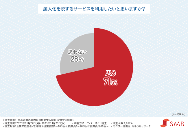 「属人化を脱するサービスを利用したいと思いますか?」と質問したところ、7割以上の方が『思う(71.5%)』と回答しました。