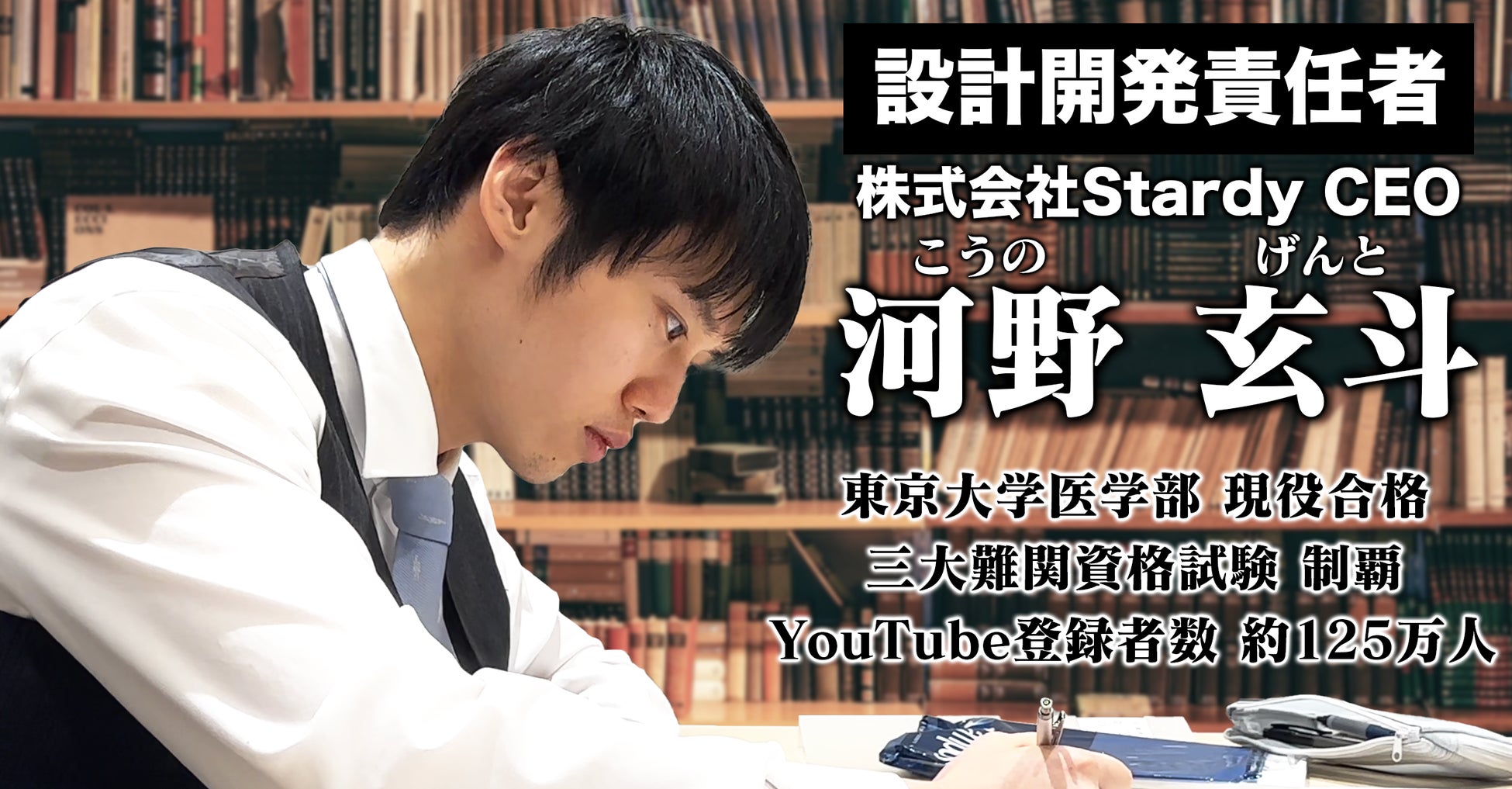 河野玄斗は、東京大学理科三類(医学部)に現役合格。在学中に司法試験に合格し、医師国家試験にも合格。2022年、公認会計士に挑戦し11月に資格を取得。「東大医学部の神脳」と呼ばれた東大医学部在学中から教育系YouTuberとして「Stardy -河野玄斗の神授業」をスタート。タレントとしても各メディアに出演。河野玄斗のYouTubeは登録者数125万人(2024年8月現在)を誇り、今も自ら学び挑戦する姿に多くの支持を得ています。