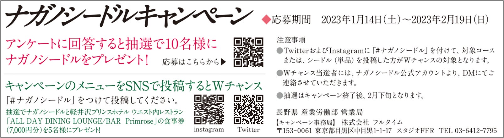 キャンペーン期間中に対象コースを召し上がった方およびシードルをご注文された方で、お食事の写真をSNSに投稿いただいた方の中から抽選で、ナガノシードルと軽井沢プリンスホテルウエスト内レストラン「ALL DAY DINING LOUNGE/BAR P r i m r o s e」のお食事券7,000円分を5名様にプレゼントいたします。