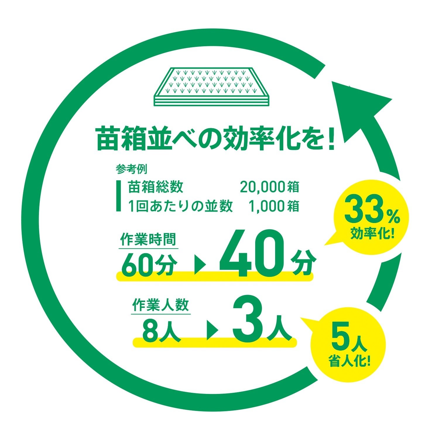作業が効率的になる分、作業に必要な人手も削減できます。例えば、今までだったら5~8人必要だった苗箱並べの作業が、3人でできるように。人手不足のこのご時世、苗箱並べの期間だけ人手を集めるのも大変ですよね。人件費も削減できて、ダブルで効率的です。
