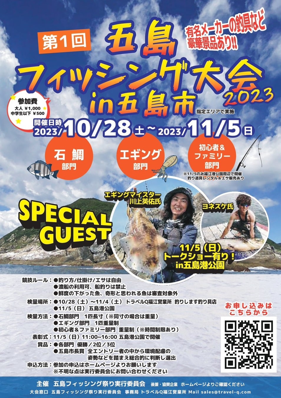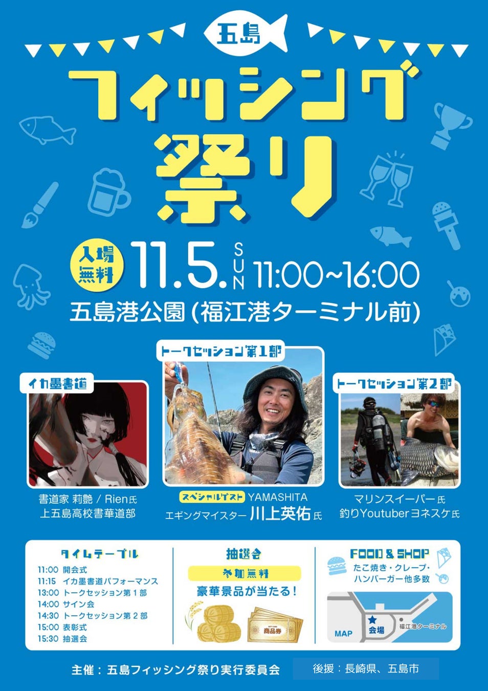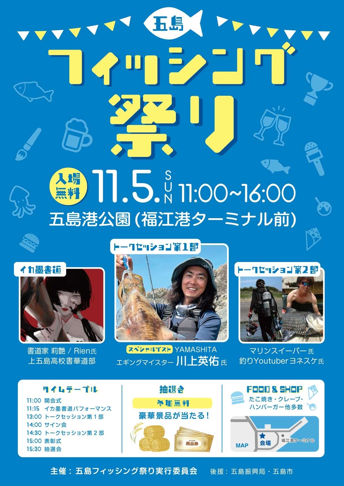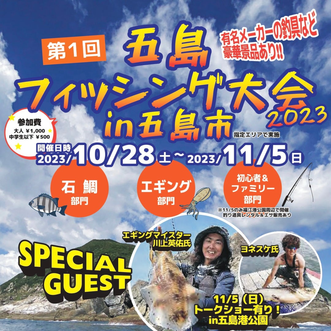 その他、大会最終日11/5(日)には表彰式をはじめ、五島港公園を会場に超豪華ゲスト「大人気のエギングマイスター川上英佑氏」「人気釣りユーチューバーヨネスケ氏」のトークショーや豪華景品があたる抽選会など様々な企画を用意しています。釣り大会の参加は、事前エントリー制です。皆さん釣りの聖地・五島での釣りをお楽しみください。