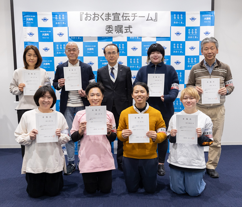 2024年1月、大熊町役場で委嘱式が開かれ、「おおくま宣伝チーム」メンバー8人に委嘱状と腕章が手渡されました。委嘱期間は令和7年3月31日まで。吉田淳町長は「復興に向けて着実に前進する大熊町を多くの方に知ってもらうため、それぞれの立場で町の魅力や情報を発信してほしい」と述べ、メンバーの活躍に期待を寄せました。