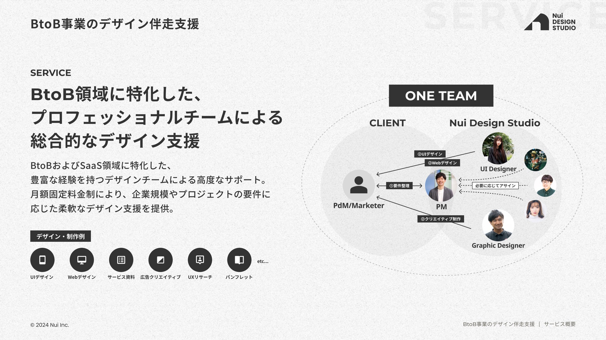 BtoBおよびSaaS領域におけるデザインの重要性が高まる中、Nui DESIGN STUDIOは、プロフェッショナルチームによる総合的な支援を提供します。新規事業開発からマーケティングに必要なクリエイティブ制作まで、クライアントのニーズに応じたデザインサポートを実施。月額固定料金で、社内デザインチームのような柔軟なサポートを実現します。