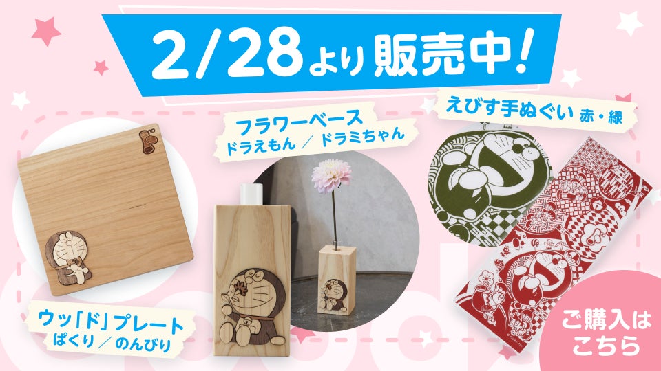 ドラえもんチャンネルアプリ公式オンラインストアでは、新商品『フラワーベース ドラえもん・ドラミちゃん』、『ウッ「ド」プレート ぱくり・のんびり』、『えびす手ぬぐい 赤・緑』を2023年2月28日(火)より発売いたします。