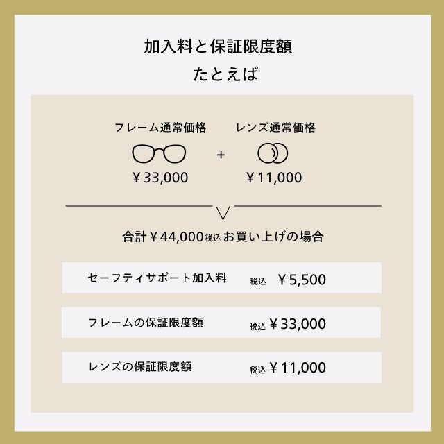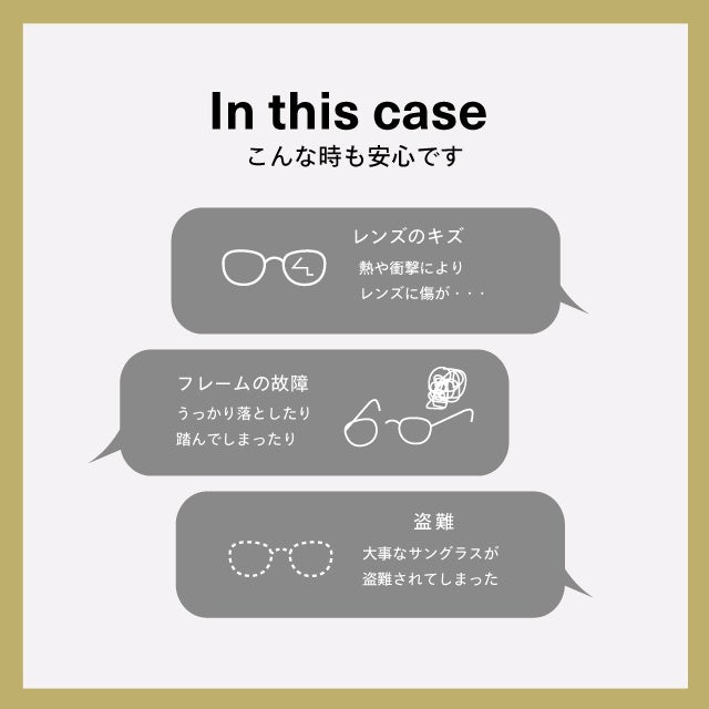 メガネを掛けたまま眠ってしまって形がつぶれてしまったり、お子さまがメガネで遊んで破損してしまったということはありませんか?また、旅先などで盗難に遭ってしまい大事なメガネやサングラスが無くなってしまったなんていうことも。そんなときのためにSAFETY SUPPORTに入っていれば安心です。