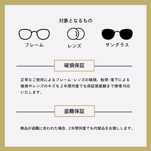 正常なご使用によるフレーム・レンズの破損、転倒や落下による破損やレンズの傷も2年間何度でも保証限度額まで修理対応いたします。