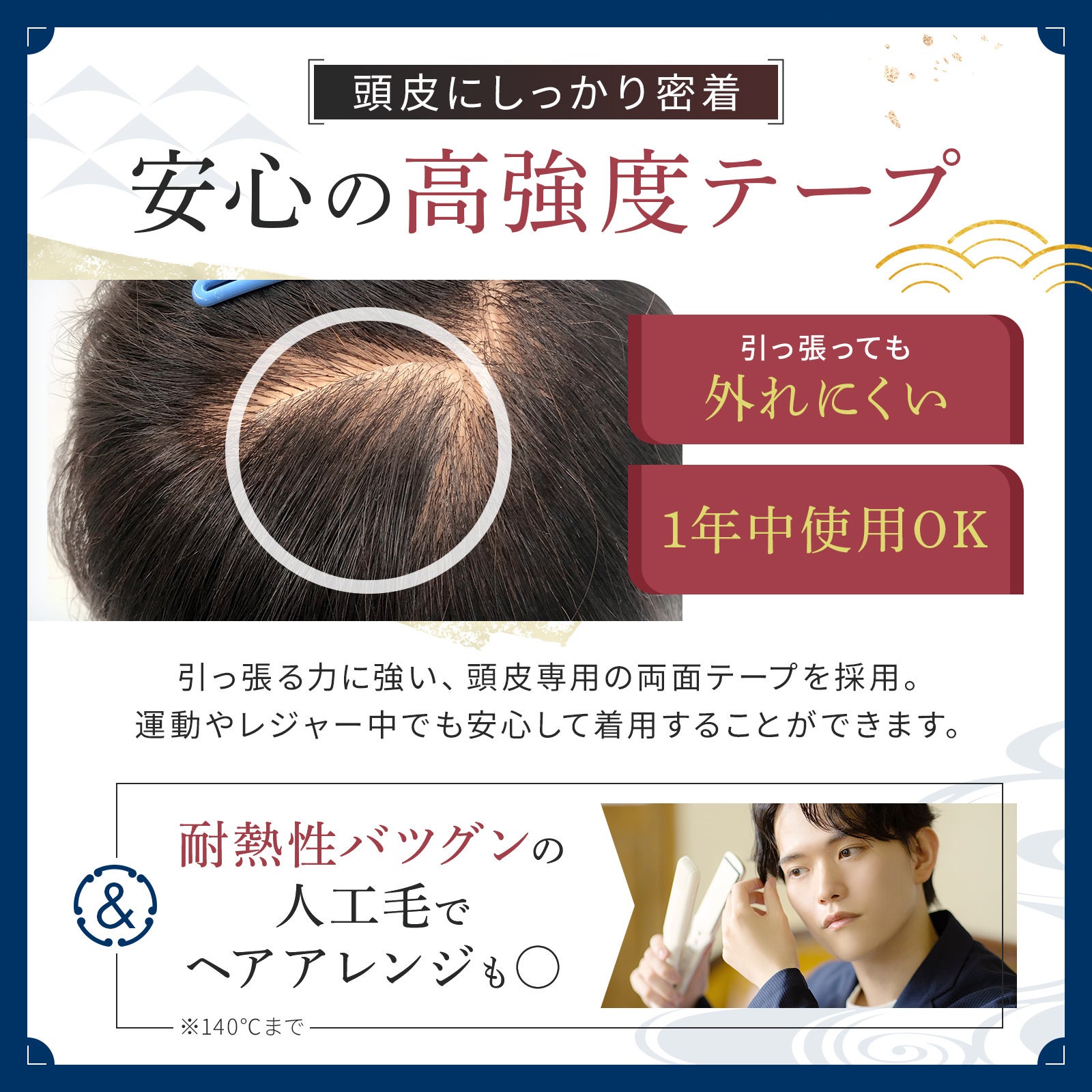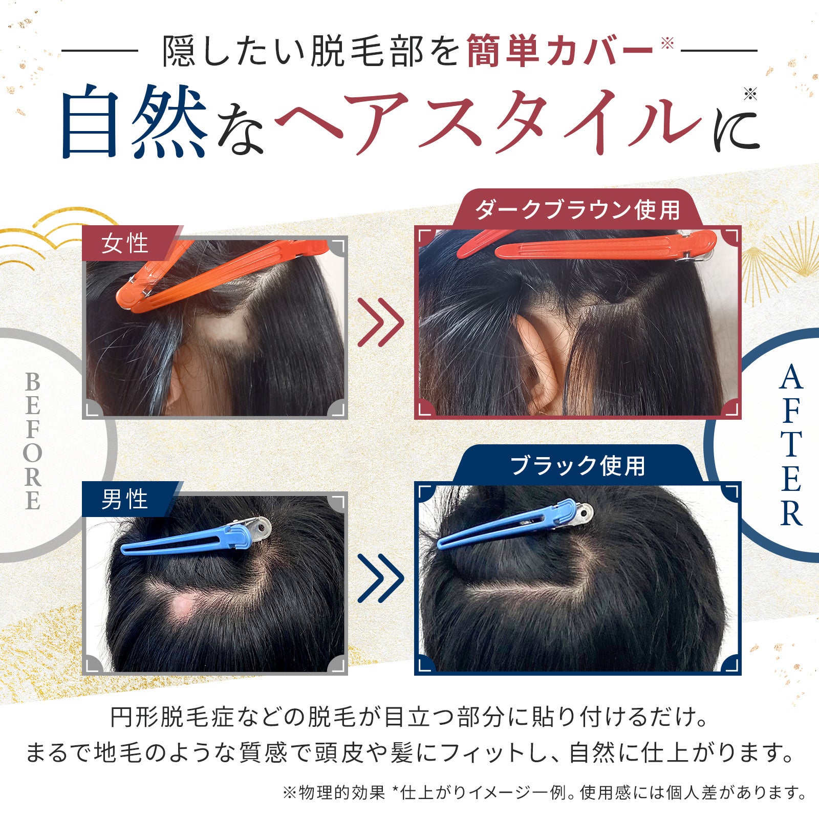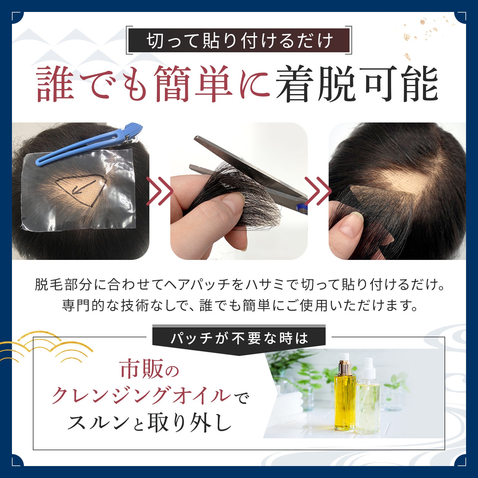 両面テープを使って貼りつけるタイプの円形脱毛症用部分ウィッグです。外出する時などの患部を隠したい時には着用し、治療時(塗り薬を塗る時)や就寝前には外していただくことができます。両面テープは、使用毎に取り換えるため、衛生的にご利用いただけます。