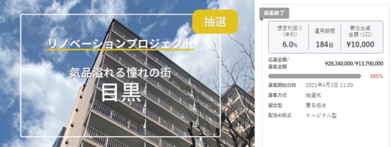 出資応募総額:28,340,000円(募集総額に対して205%)