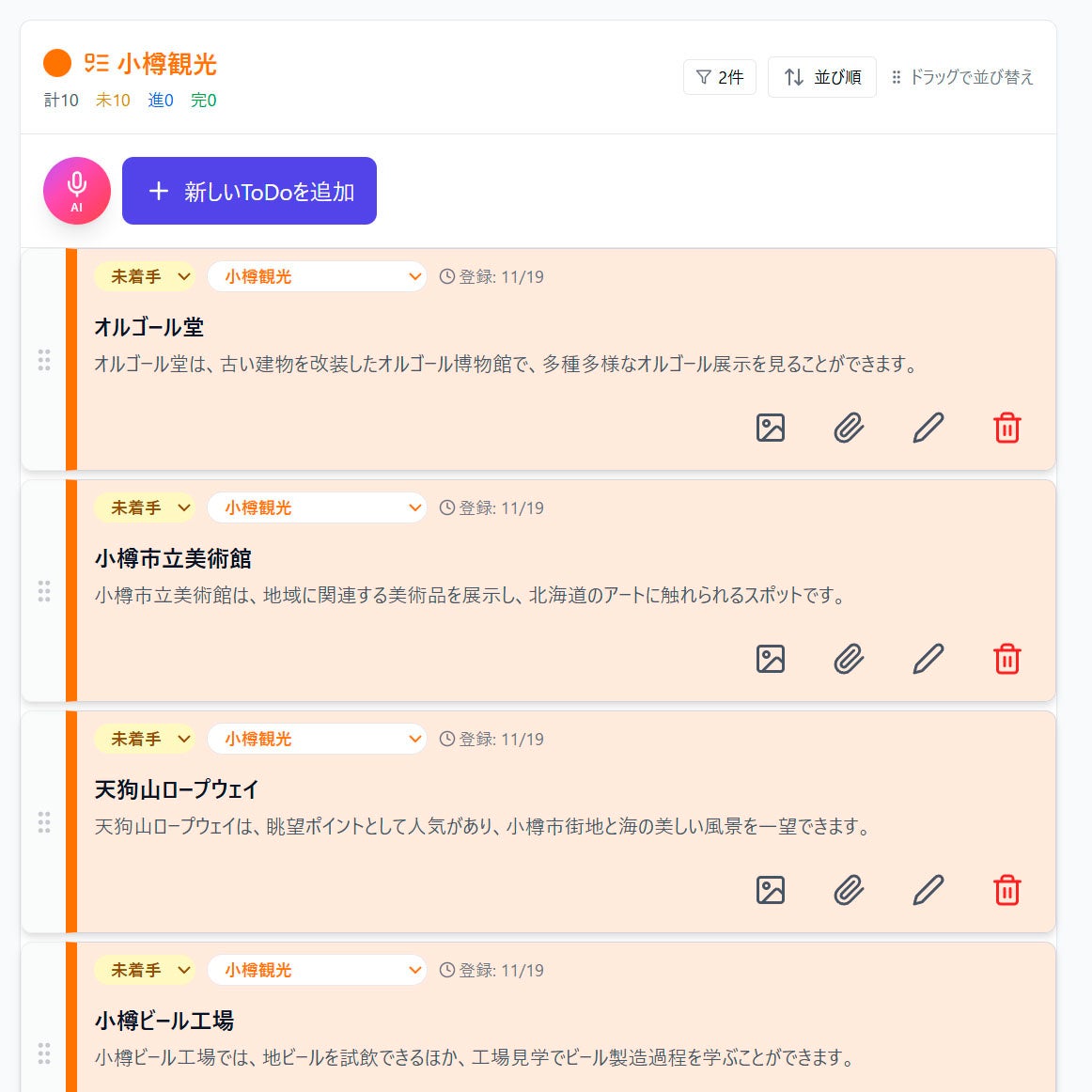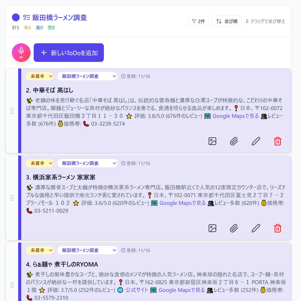 → “ラーメン調査”プロジェクトが自動作成され、5店舗がタスク登録。並び替えやメモ追記も可能。