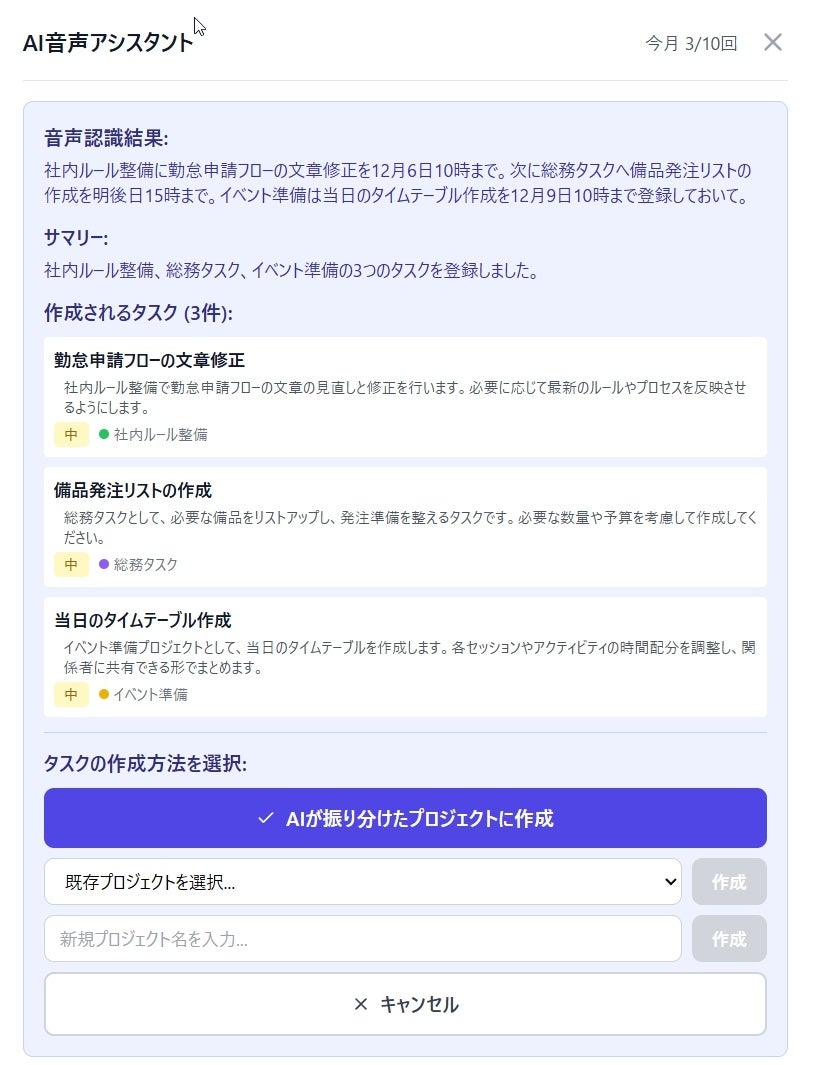 話すだけで複数プロジェクトに自動登録「AI音声タスク生成」