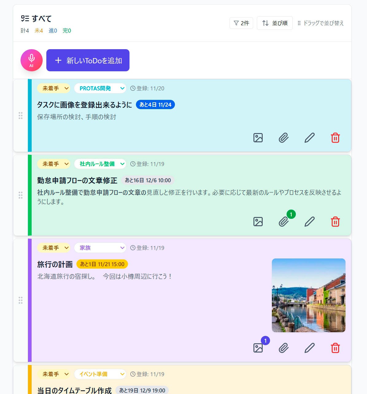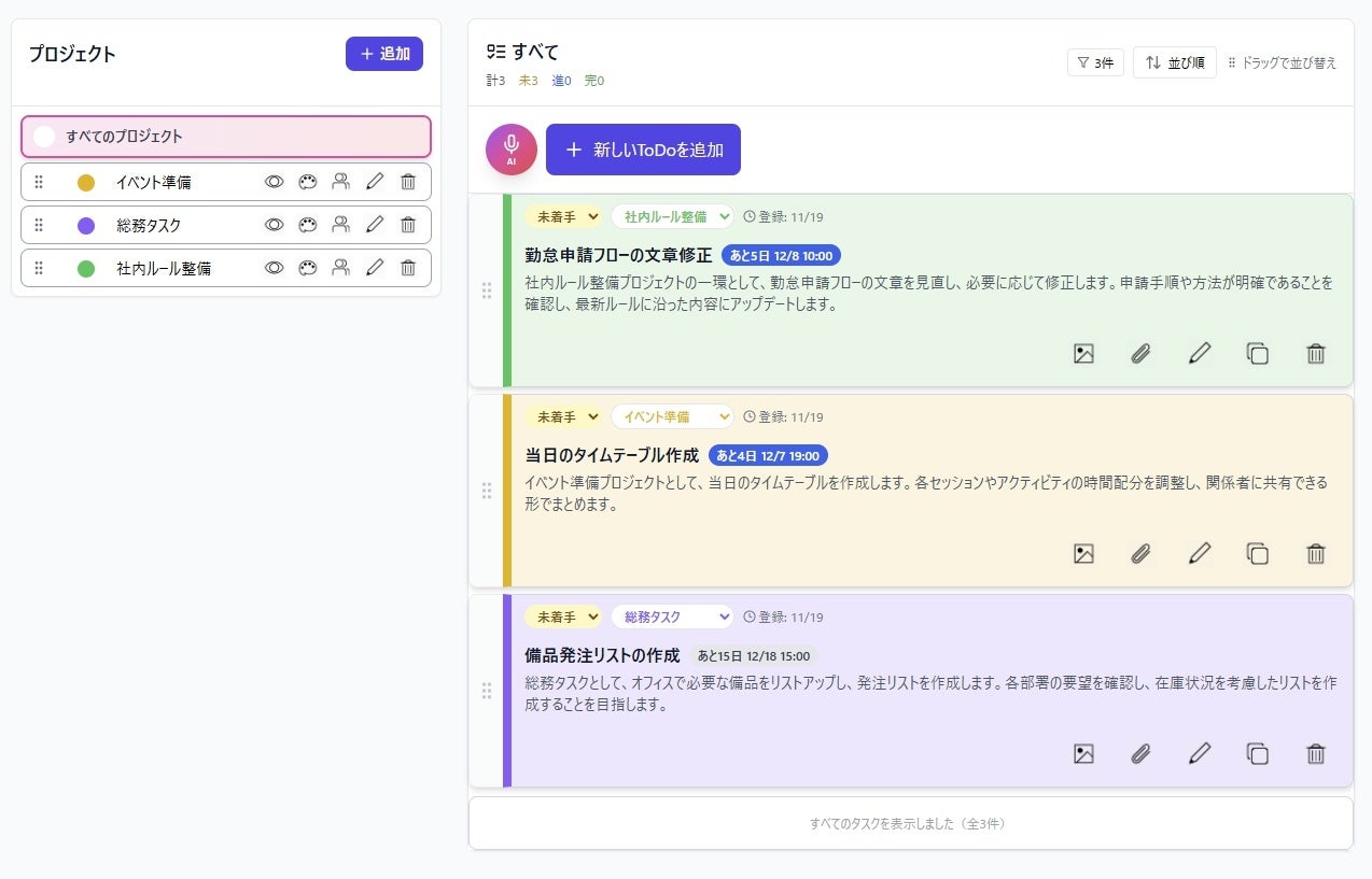 自然な日本語で指示すると、AIが内容を解析し、**期限・優先度・プロジェクト振り分けまで自動で実行。手入力で数分かかる整理を、約10秒の会話で完結できます。