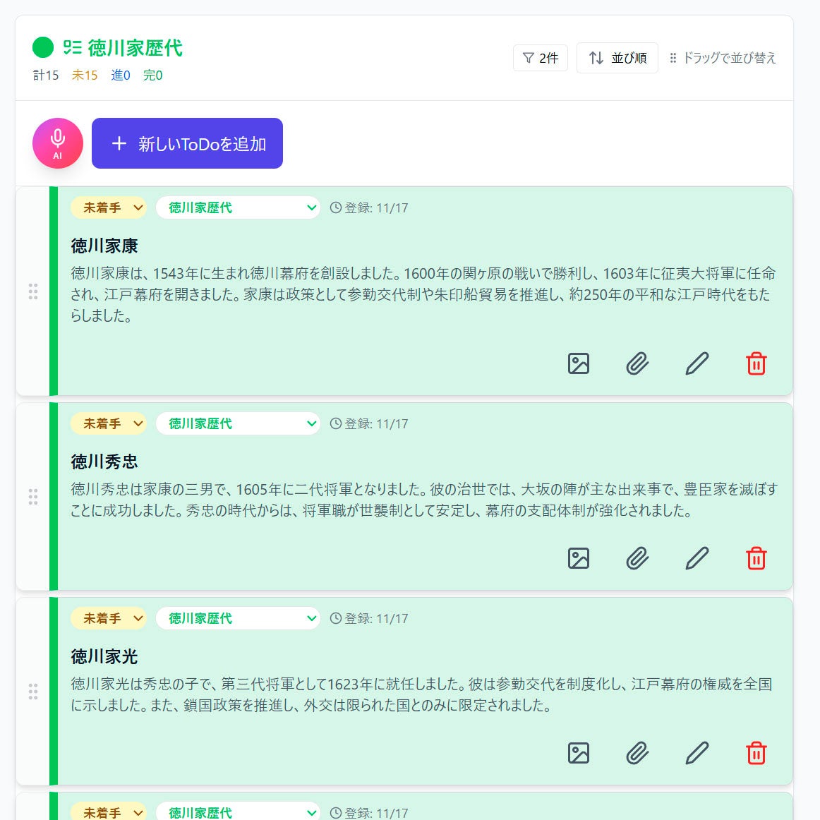 → 歴代将軍を1タスク=1人物で自動作成、要点メモ欄も付与。