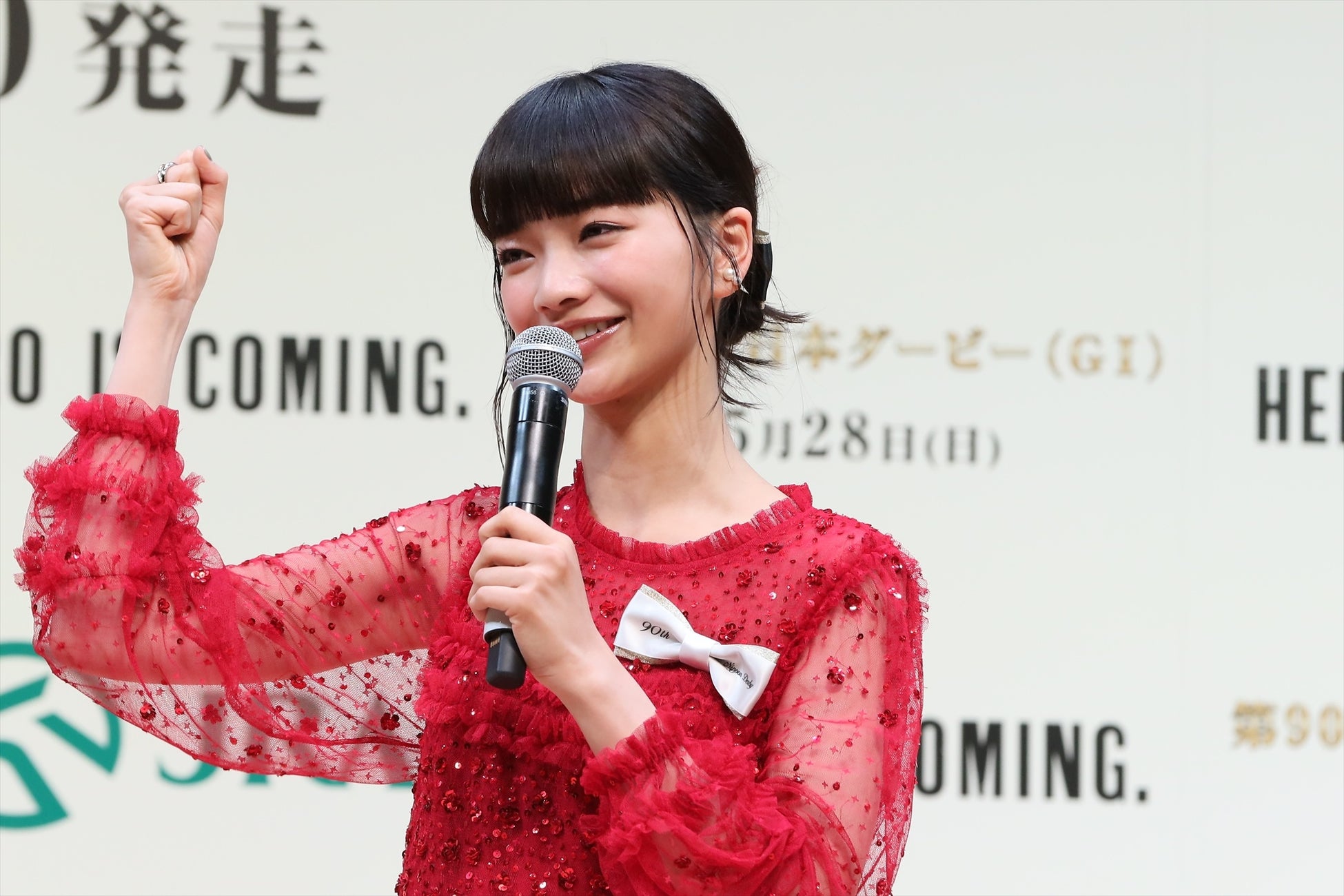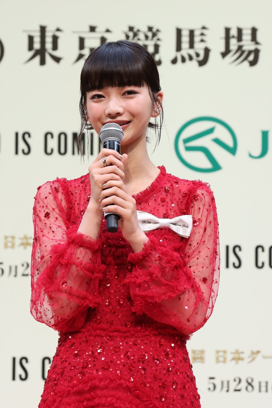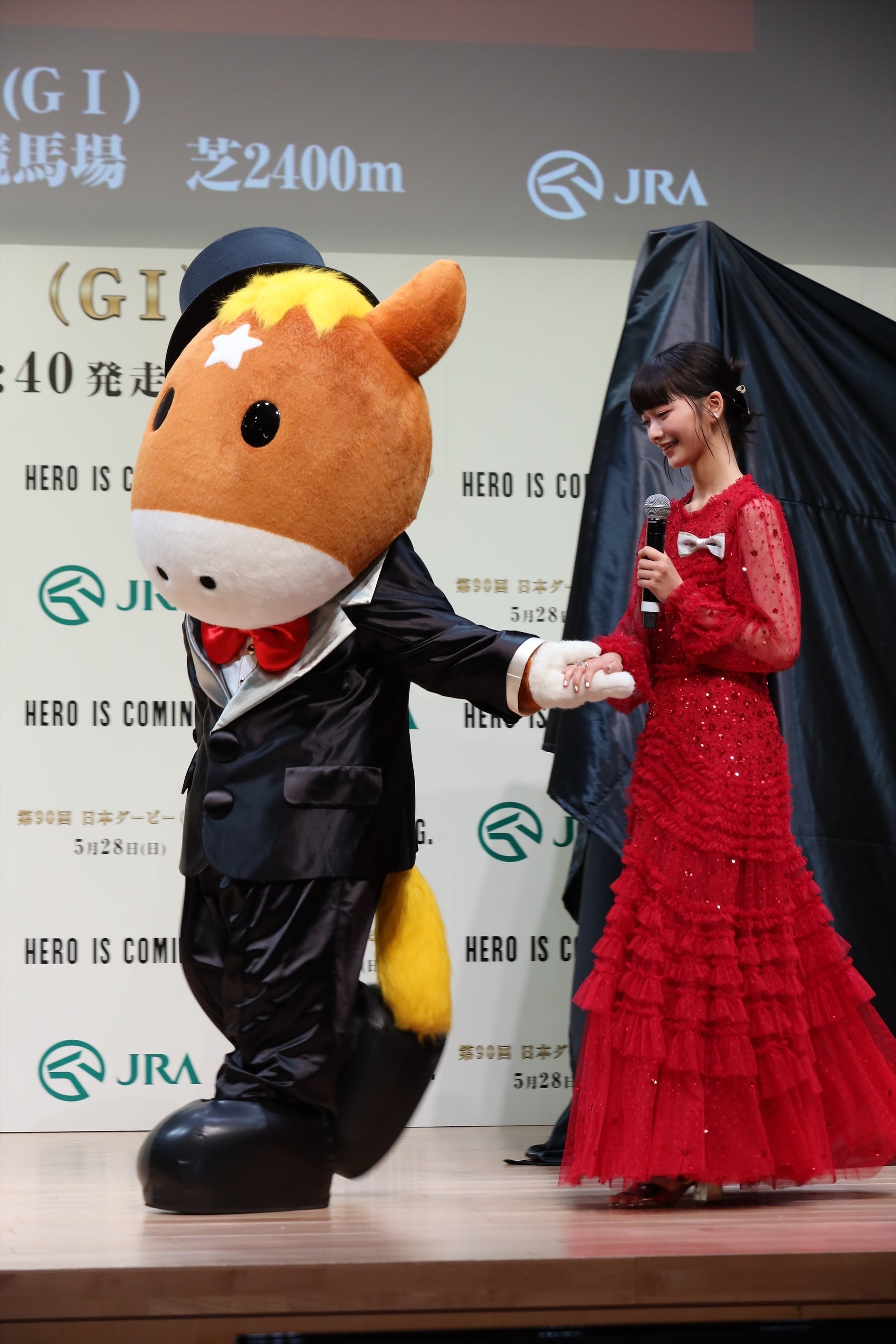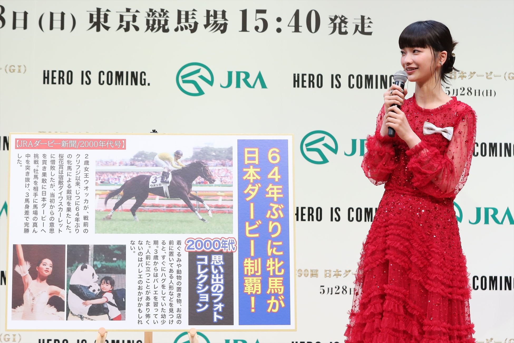 発表会冒頭では、司会進行を務める、2018年から4年連続で日本ダービーの実況を担当し、長年に渡り競馬シーンの第一線で活躍するアナウンサーの福原 直英さんの呼びかけで、日本ダービーを象徴するような真っ赤な衣装をまとった見上さんが、 JRAのマスコットキャラクター「ターフィー君」にエスコートされて入場。福原さんから「素晴らしいドレスですね!」と声をかけられた見上さんは、「昨年は勝負服を着させていただいたのですが、今年もダービーらしい真っ赤なドレスを着させていただきました。今週末にいよいよ行われるんだなと、とてもわくわくしています!」と、興奮した姿を見せていました。