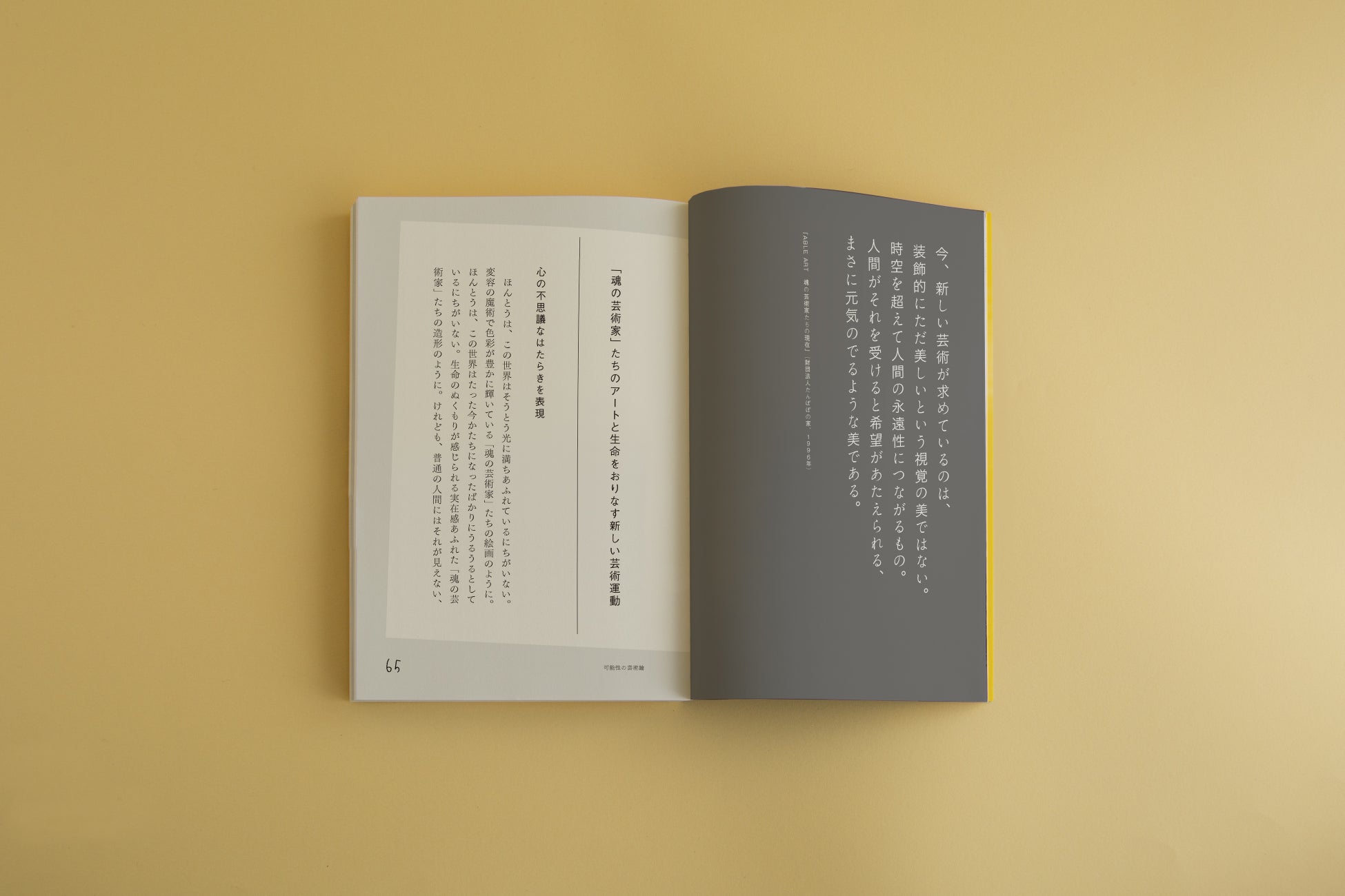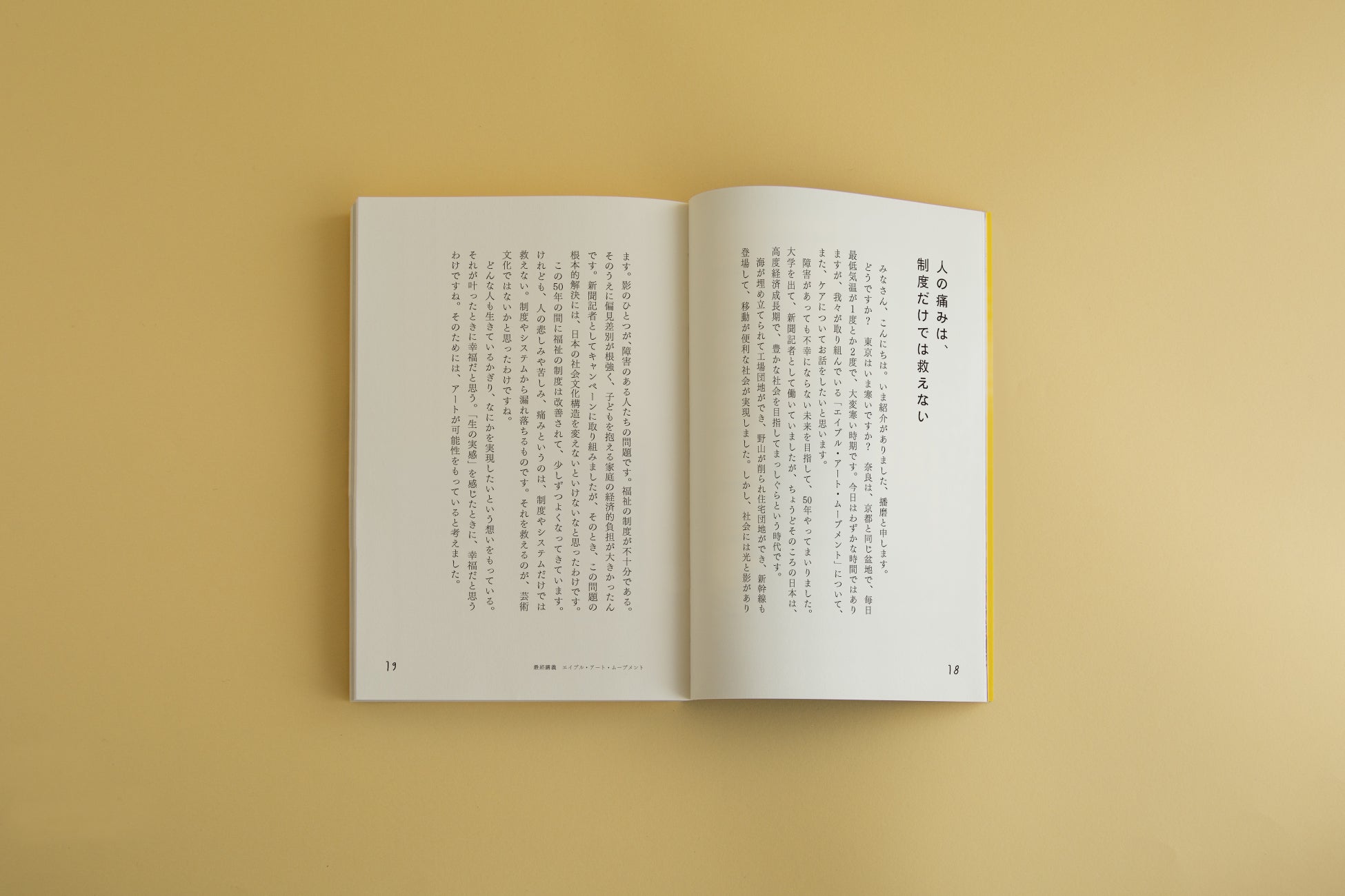 人の痛みは、制度だけでは救えない/「美は悲しみにあり」/すべての人間に眠るアートのDNA/新しい思想としてのエイブル・アート/私は、私と私の環境/エイブルアート・カンパニー/アート×デザイン×しごと Good Job!センター香芝/愛と祈りの継承 NEW TRADITIONAL/アートの社会化/社会のアート化/障害のある人のアートをどう見るか/人間はつながりのなかに生きている/社会を動かす7つのP ほか