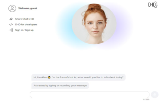 (2023年3月7日、イスラエル、テルアビブ発 ) ジェネレーティブ AIとクリエイティブメディアの世界的リーダーであるD-ID(https://www.d-id.com/)は、誰もが自然な方法でリアルなアバターを通じてAIと会話できるウェブアプリ「chat.D-ID」(https://chat.d-id.com/)を発表しました。chat.D-IDは、D-IDが開発したテキストからビデオを生成するストリーミング技術と、Open AIの大規模言語モデルを利用したチャットサービスであるChatGPTを組み合わせることで、インタラクティブなデジタルヒューマンがユーザーと対面で会話することを可能にしました。