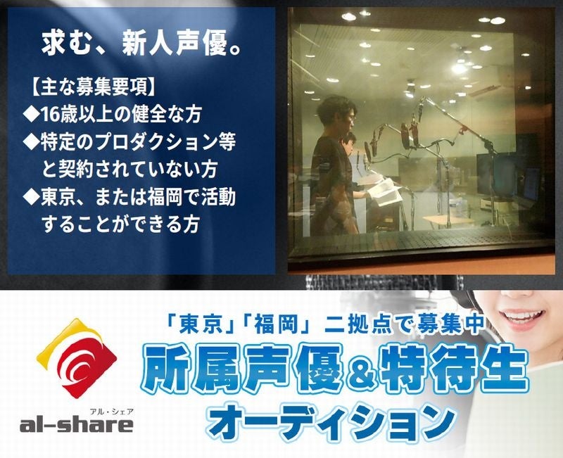 【福岡で声優になれる!!】声優事務所アル・シェア所属声優&特待生オーディションを東京・福岡で3月4月同時開催!!