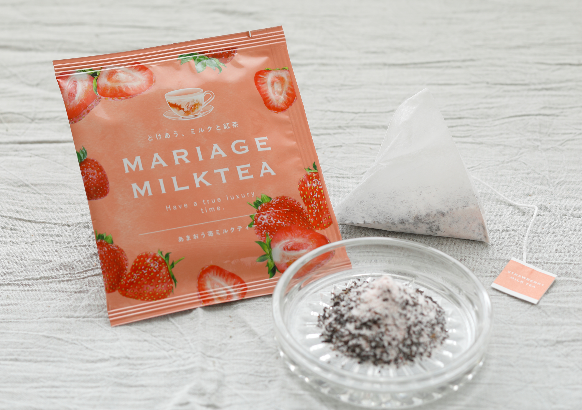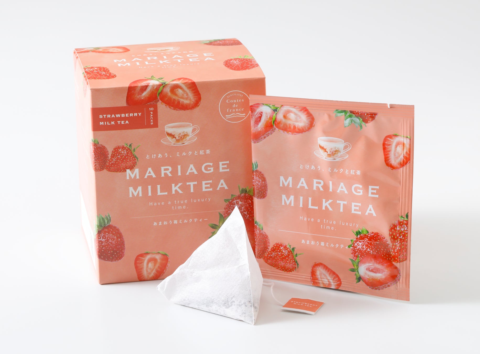 お湯を淹れるだけで楽しめる、⾹りにこだわりぬいた本格ミルクティー「MARIAGE MILKTEA(マリアージュミルクティー)」に【あまおう苺ミルクティー】が数量限定で新登場!香り豊かなアッサム茶葉、甘酸っぱくジューシーなあまおう苺と濃厚なミルクの癒しのマリアージュをお楽しみください。