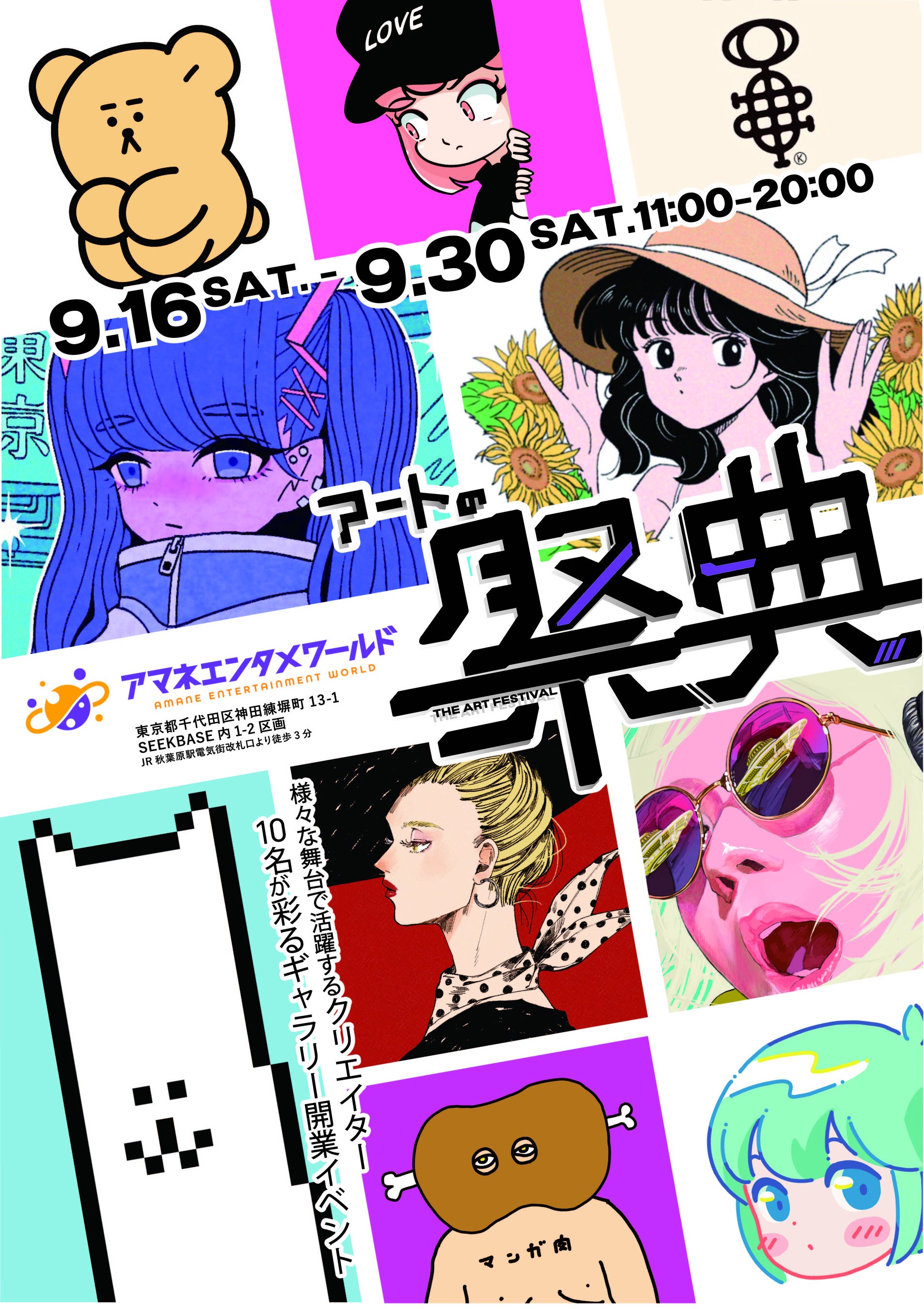 オープニングイベントとして、人気クリエイター10名が集結し、「お祭り」のテーマに沿って新作の書き下ろしを披露。SEEKBASE内では、フィジカルとデジタルの両方でアートを鑑賞することができ、メタバースギャラリーでも作品を展示いたします。NFTアートの販売やリアル作品、グッズの販売も実施いたします。
