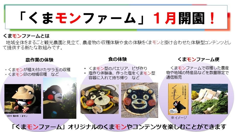 地域全体を観光農園と見立て、農産物の収穫体験や食の体験をくまモンと掛け合わせた体験型コンテンツとして提供する新たな取組みです。