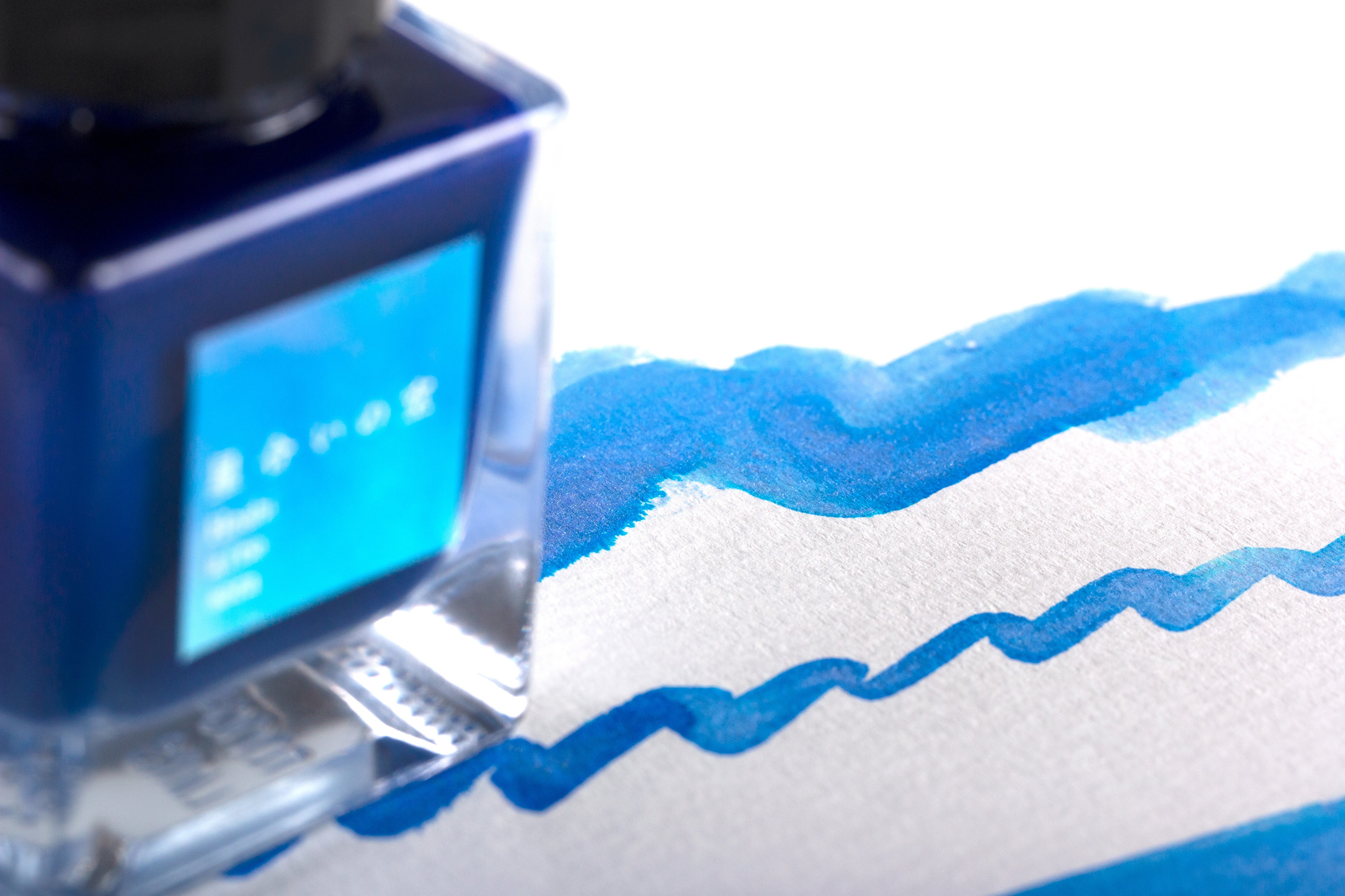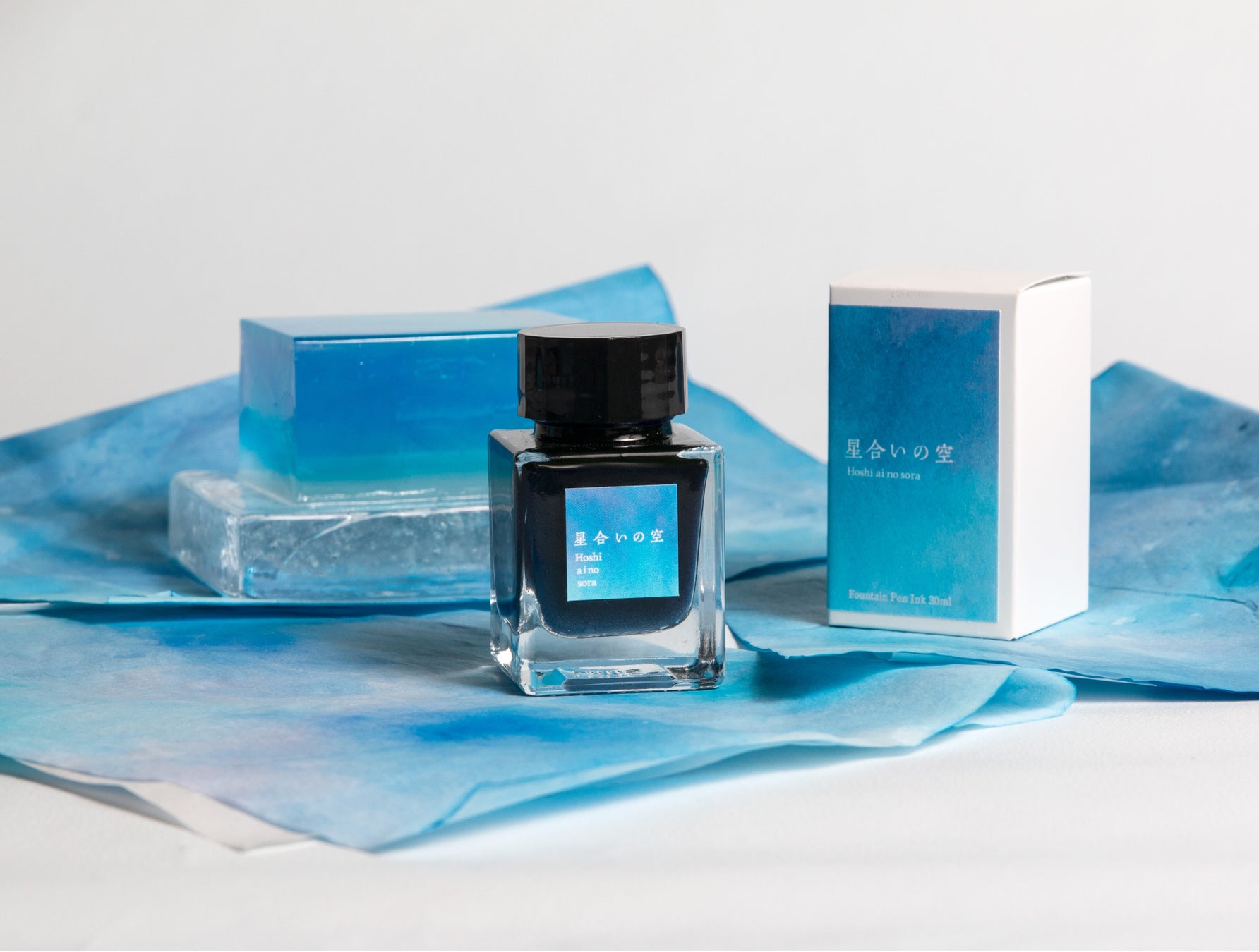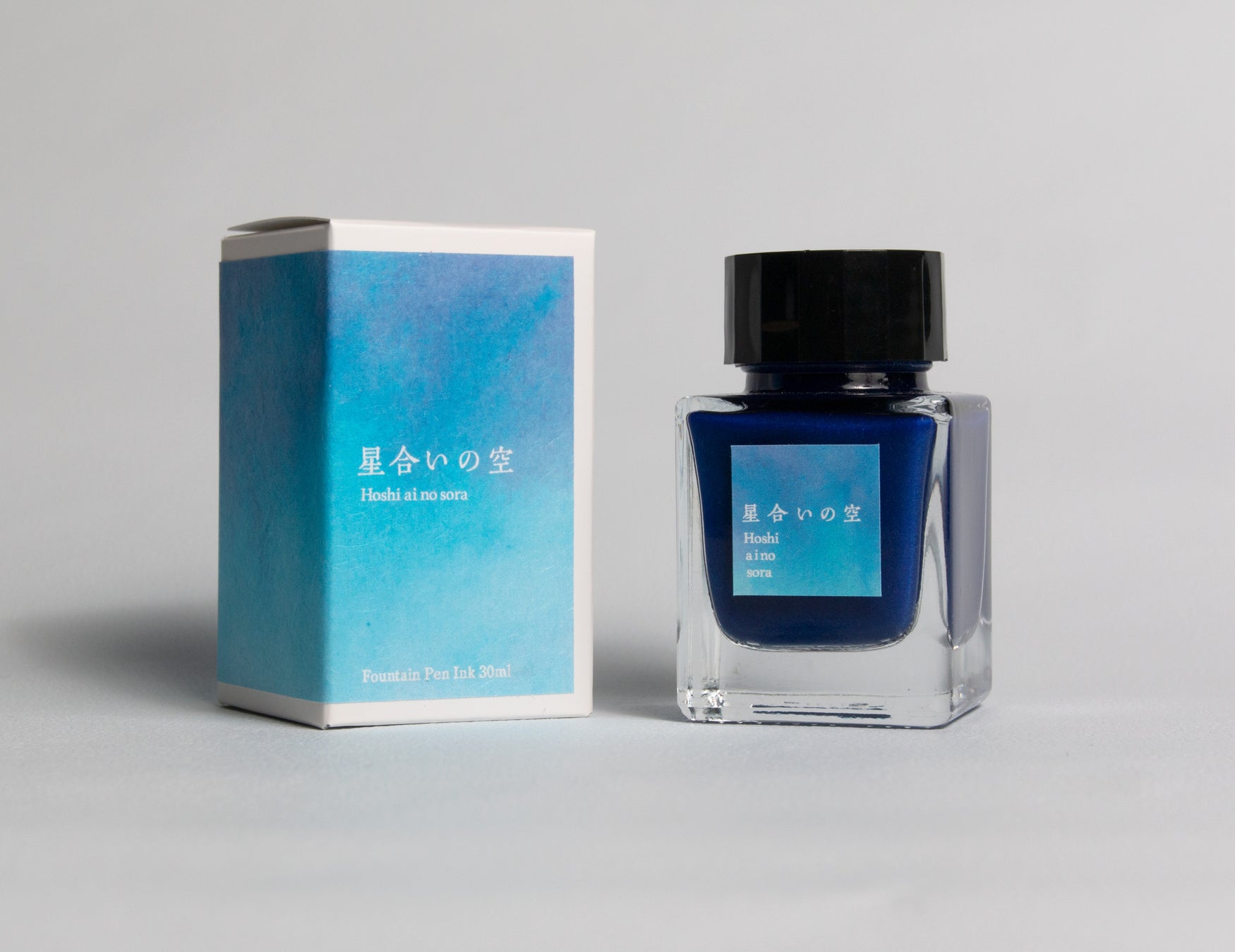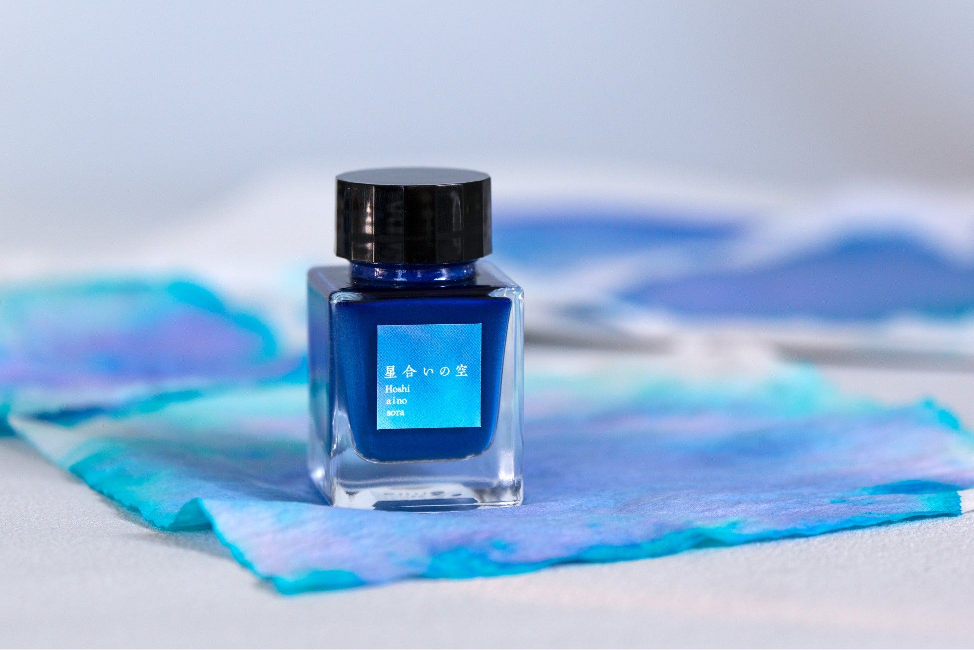 この度製作したインクはその星合いの空を表現した青色と紫色に加え銀色のラメを入れ、羊羹が持つ美しいグラデーションを表現。パッケージのシールには実際のインクを使用してデザインしました。