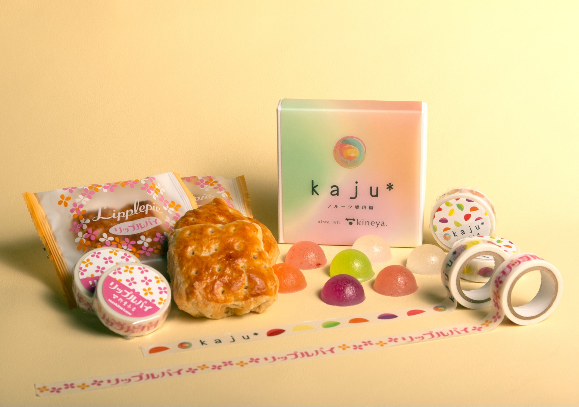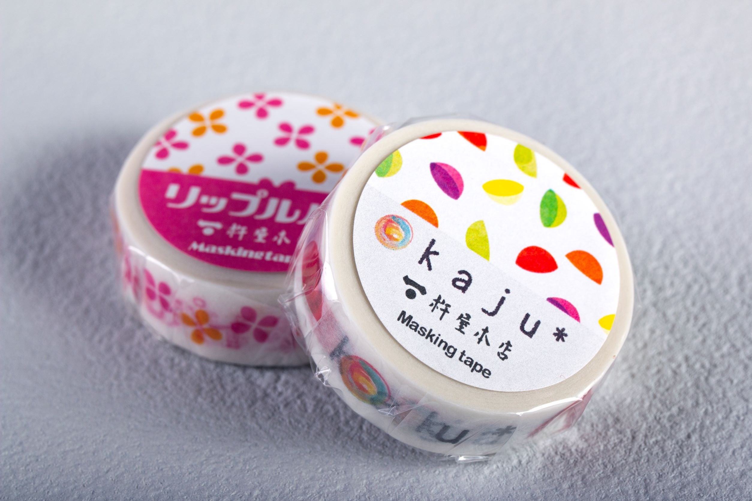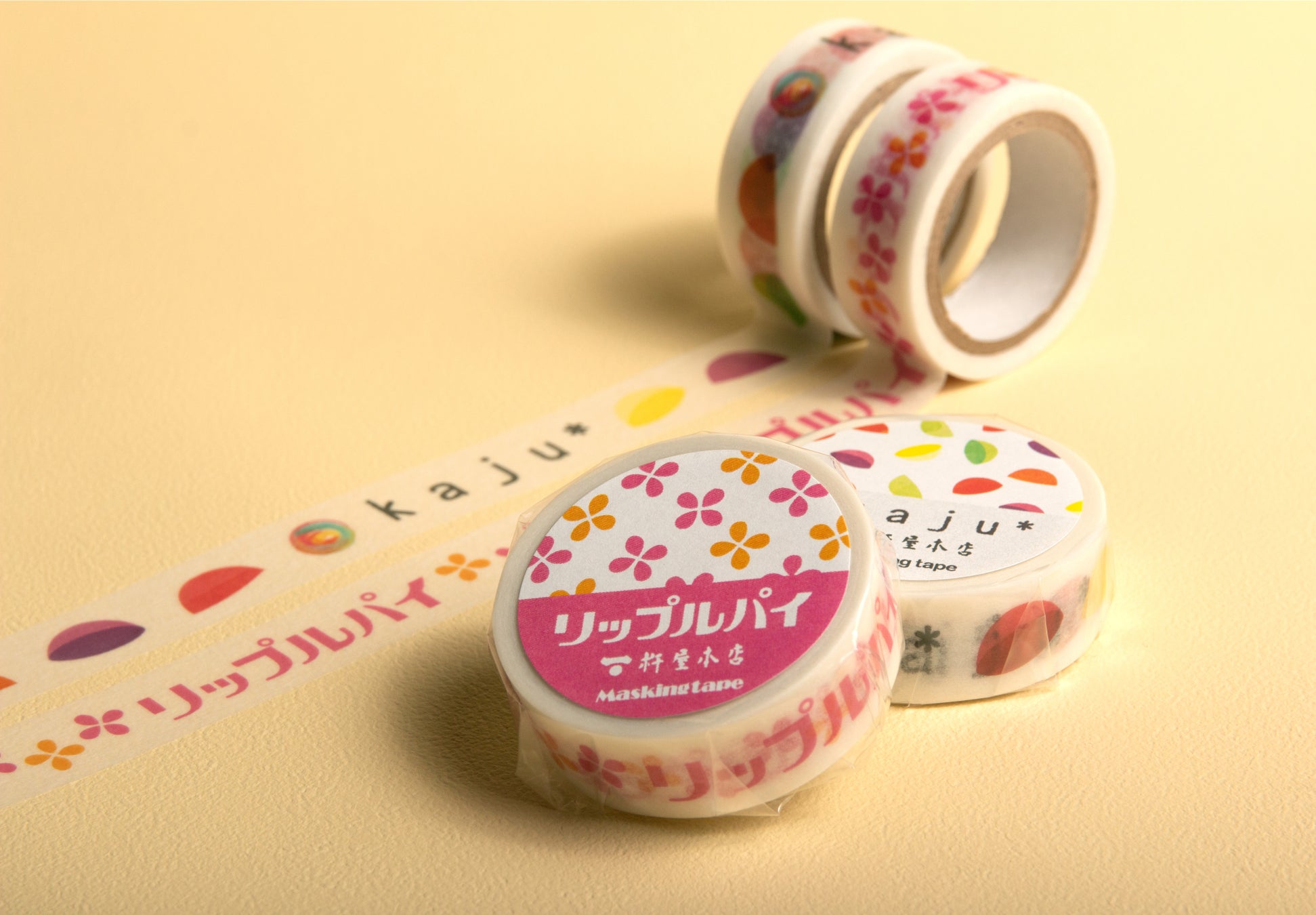 杵屋本店の57年続く代表銘菓である自家製餡に胡桃を練りこんだ「リップルパイ」と、山形でとれるフルーツ5種の果汁を使った「琥珀糖kaju*」をモチーフとしてマスキングテープをデザインしました。リップルパイのレトロなパッケージをそのままにkaju*はカラフルな5種の琥珀糖を表現したデザインです。