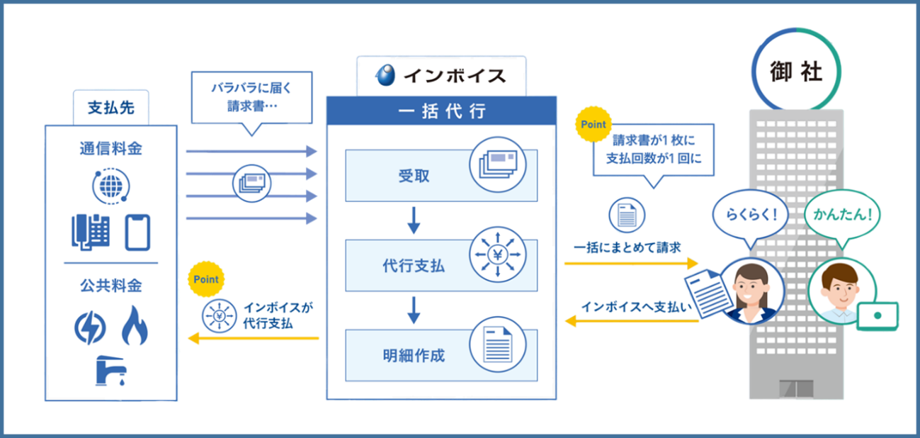 毎月、事業社ごと、拠点ごと、利用期間ごとに届く、通信費や水道光熱費の請求書をインボイスがお客様の変わりに受領。お支払いを代行し請求書を電子化してオンラインでお届けするサービスです。