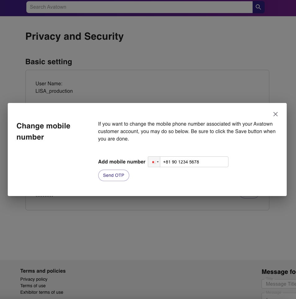 トップページ右上のマイメニューアイコンをクリックするとメニューが現れるので、[Privacy&Security]を選択し、[Primary mobile number]の項目から電話番号を追加します。