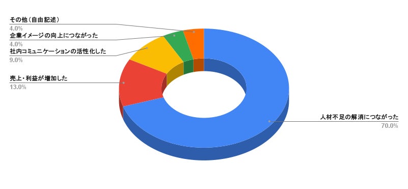外国人労働者を採用すると、70%の職場が「人材不足の解消につながった」と回答していることから、多くの職場が人材不足の解消を目的として、外国人労働者まで採用枠を拡大している可能性が示唆されました。