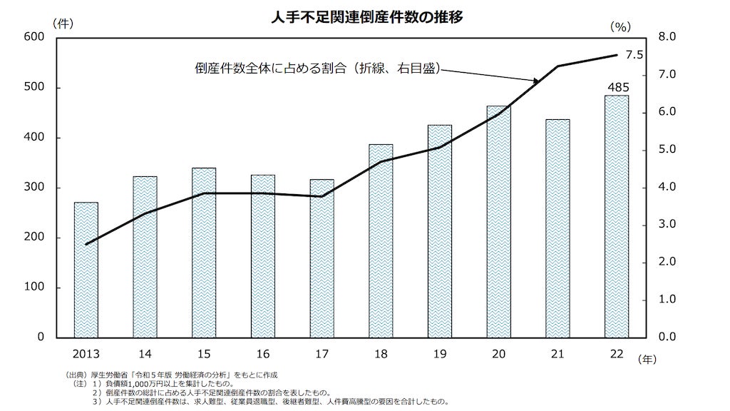 実際に、厚生労働省の発表では、人材不足により倒産する企業が増加傾向にあることがわかります。