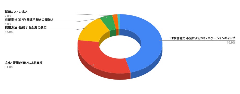 「日本語能力不足によるコミュニケーションギャップ」が46%、「文化・習慣の違いによる摩擦」が31%と、質問5(外国人労働者を採用する上で重視する要素についての設問)、やはりコミュニケーション面の課題が大多数を占めていることが判明しました。
