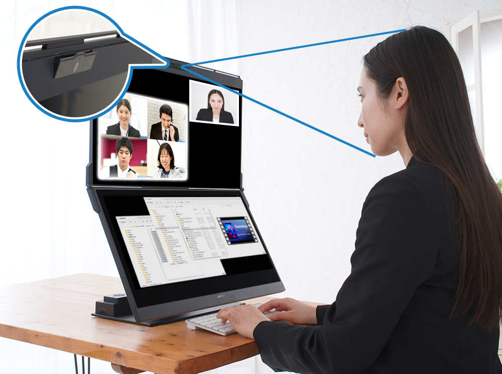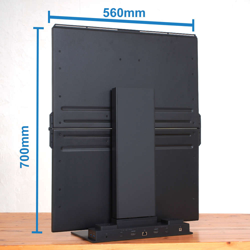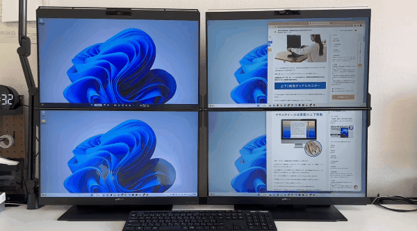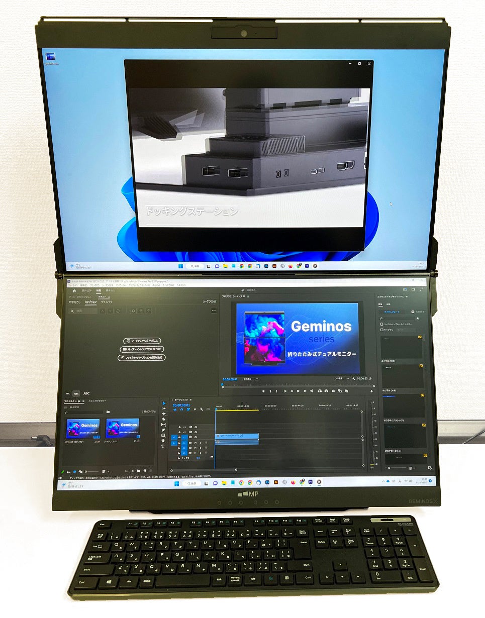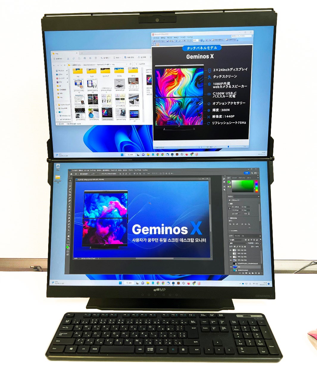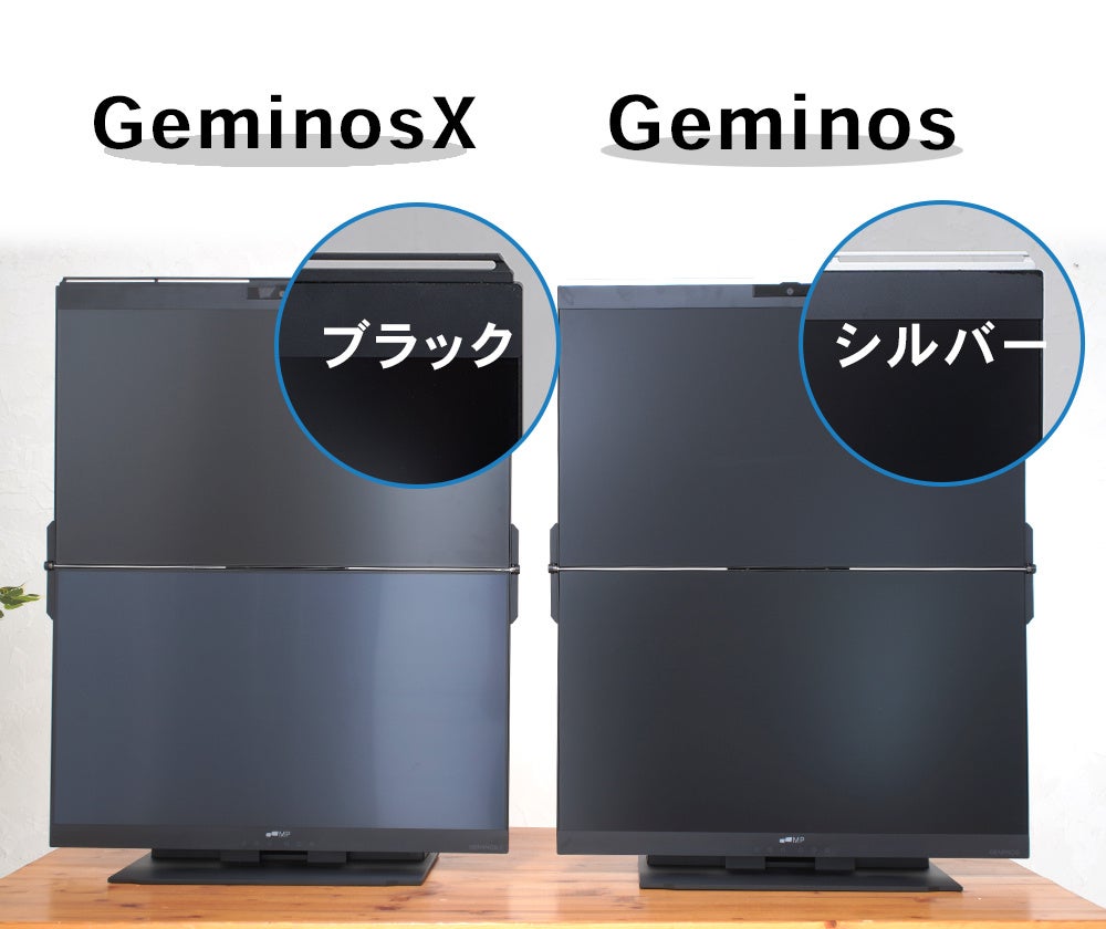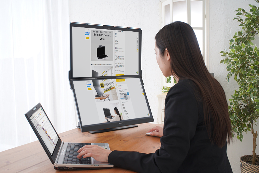 縦に積み上げて使用する高さ、角度自在の2画面モニター Geminos Wモニター