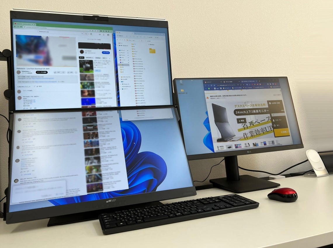 24インチモニターを縦に積み上げて使うWモニター。高さと角度を変えて閲覧を効率化