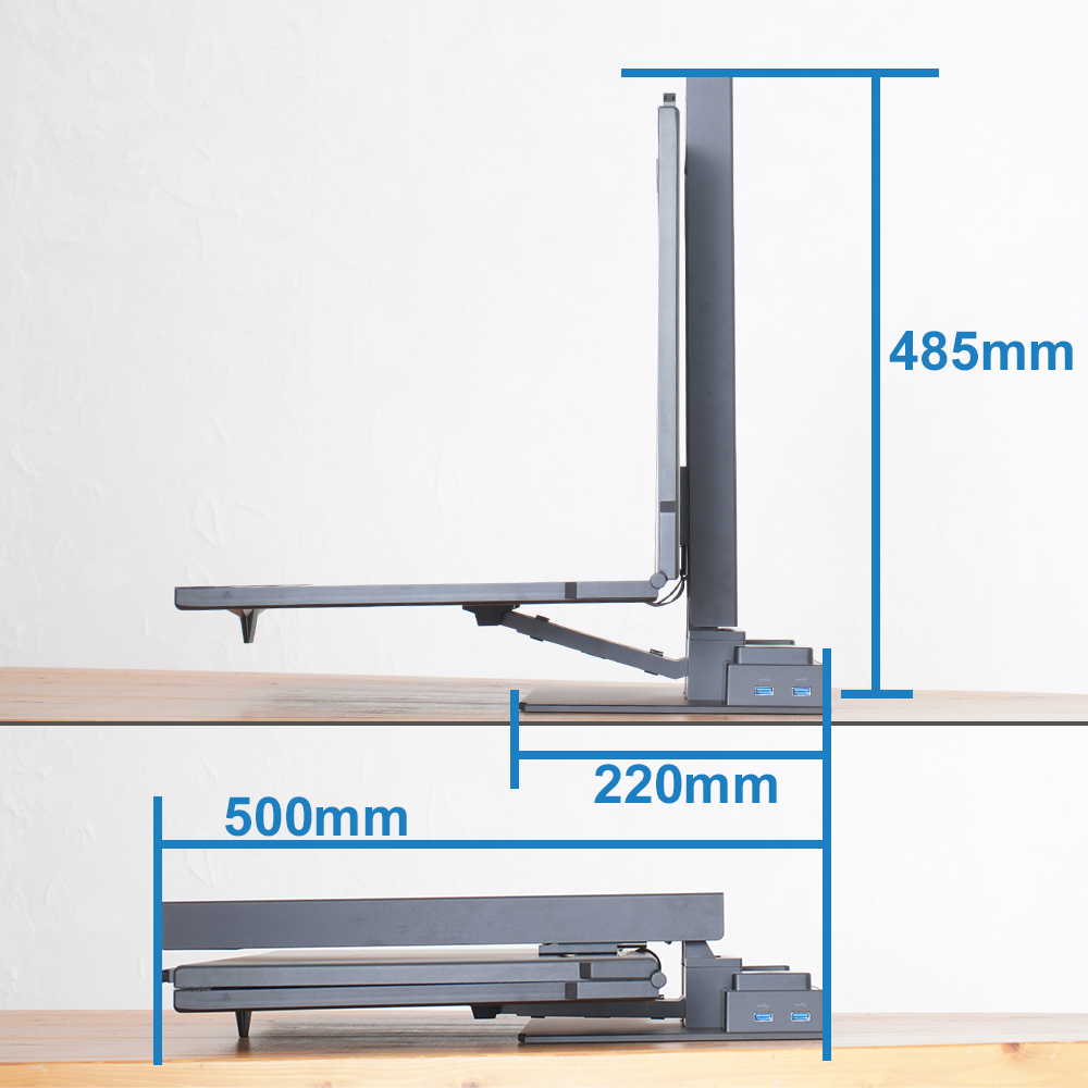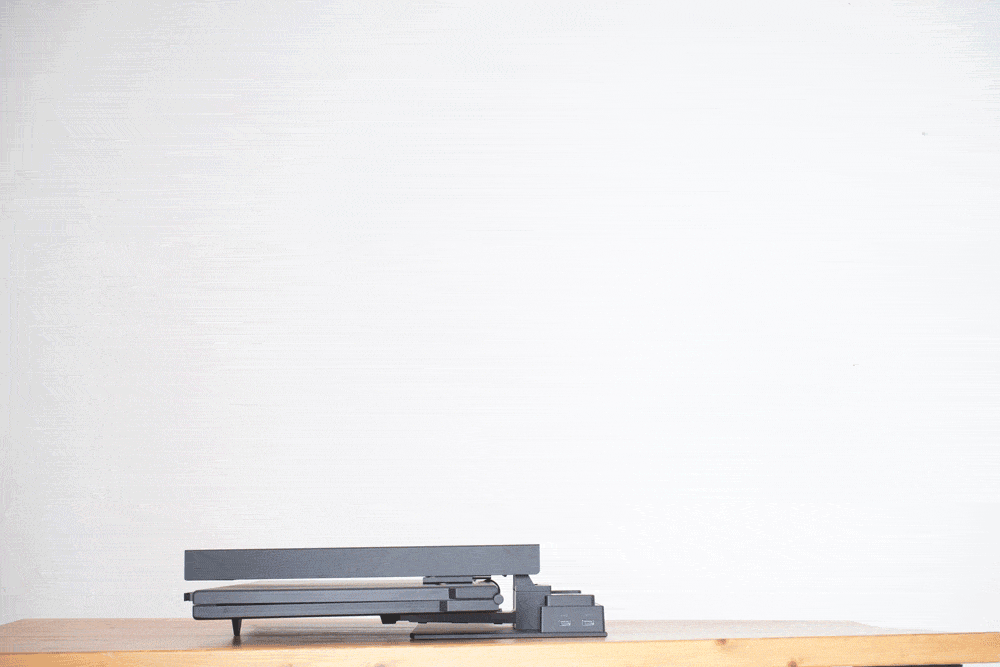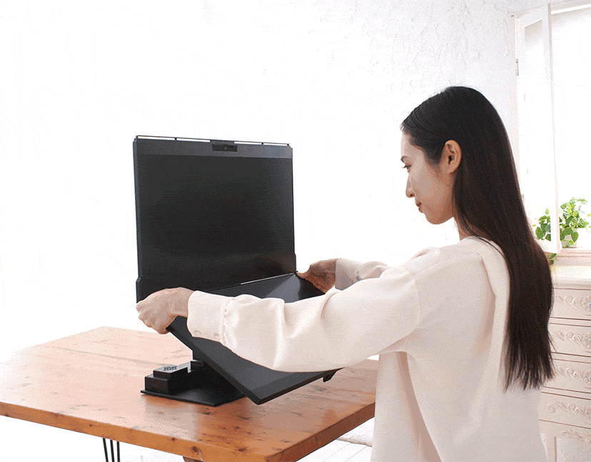 単に縦に並べるのではなくユーザーの視線を考慮し、常に画面に対して視線が正面に向くよう、上下移動と下段のモニターは角度が付くような仕組みで設計されています。