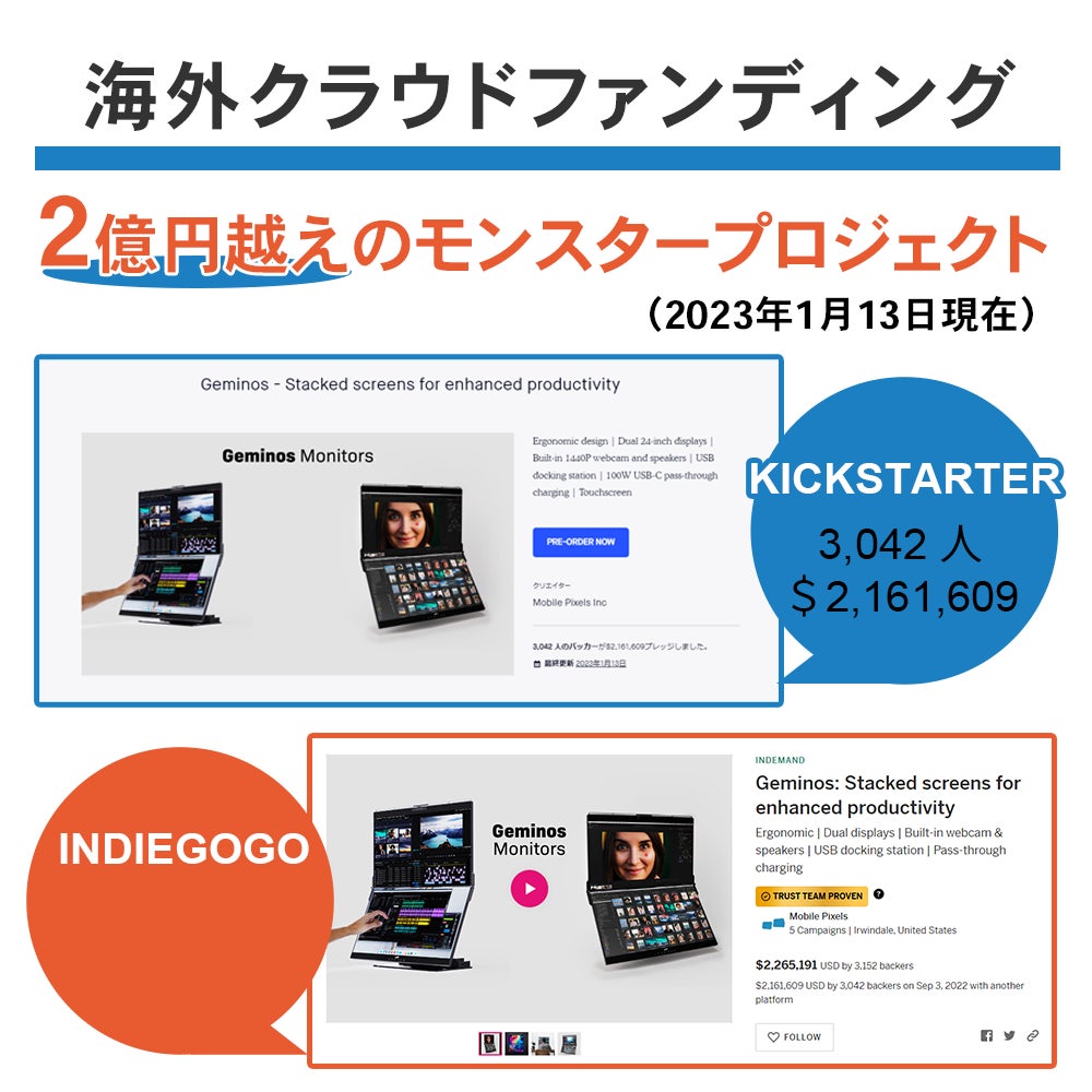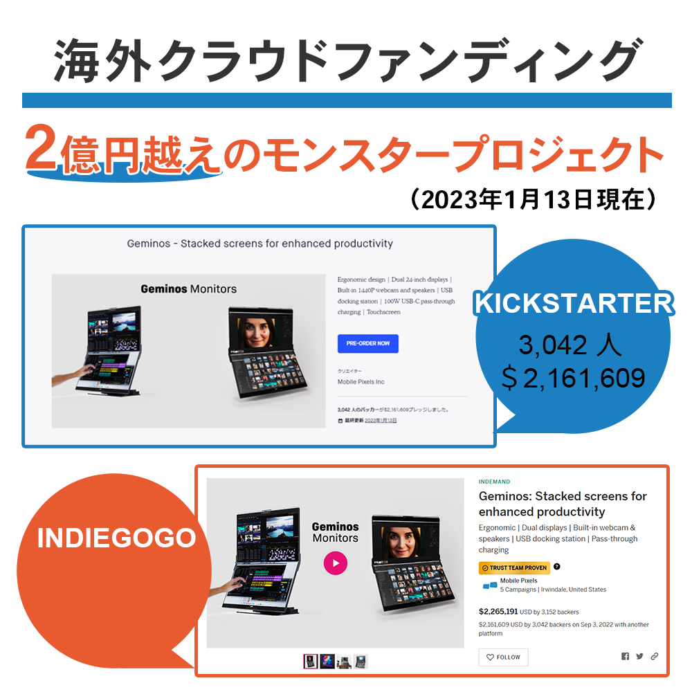 Geminosモニターは既に海外のクラウドファンディングで実行済みで、その成果は億単位を超える盛況ぶりです。