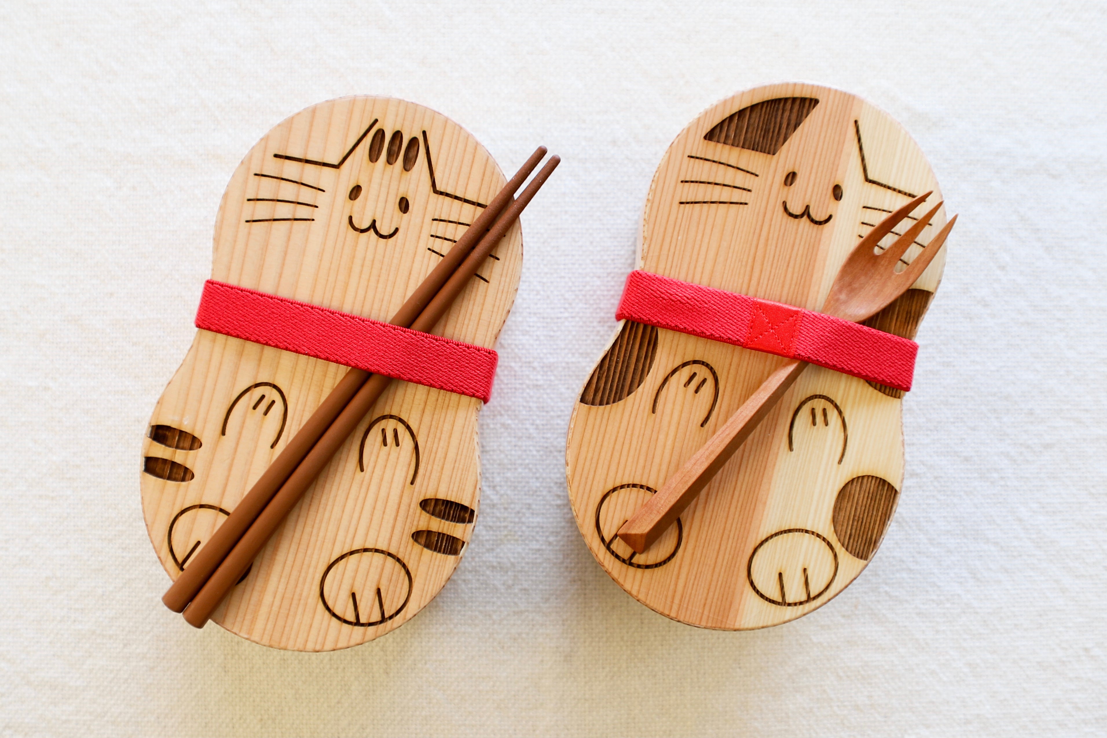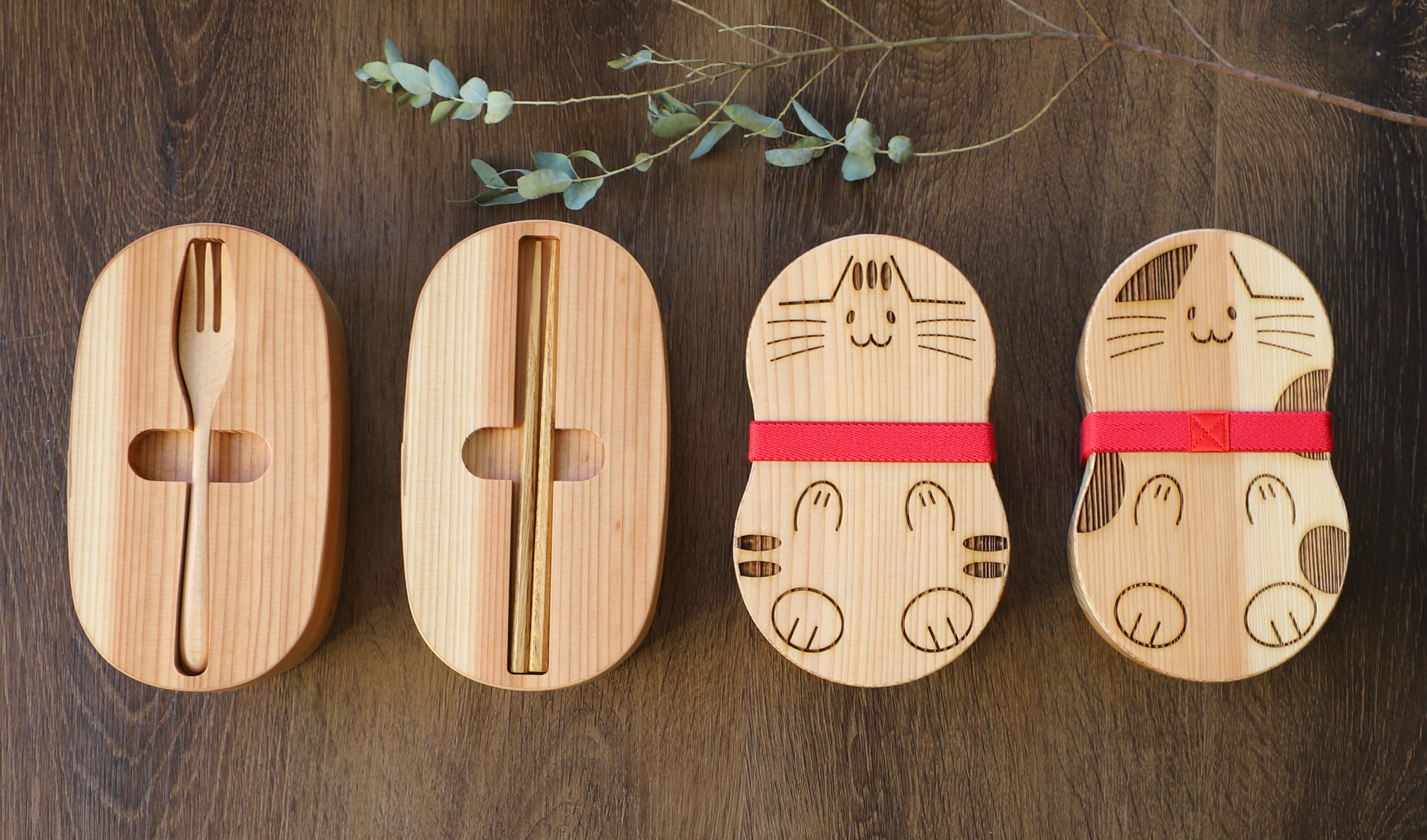 「日本の弁当箱(トラ/ブチ)」と「わっぱ弁当箱(フォークセット/箸セット)」は食演生活ECサイトにて販売中
