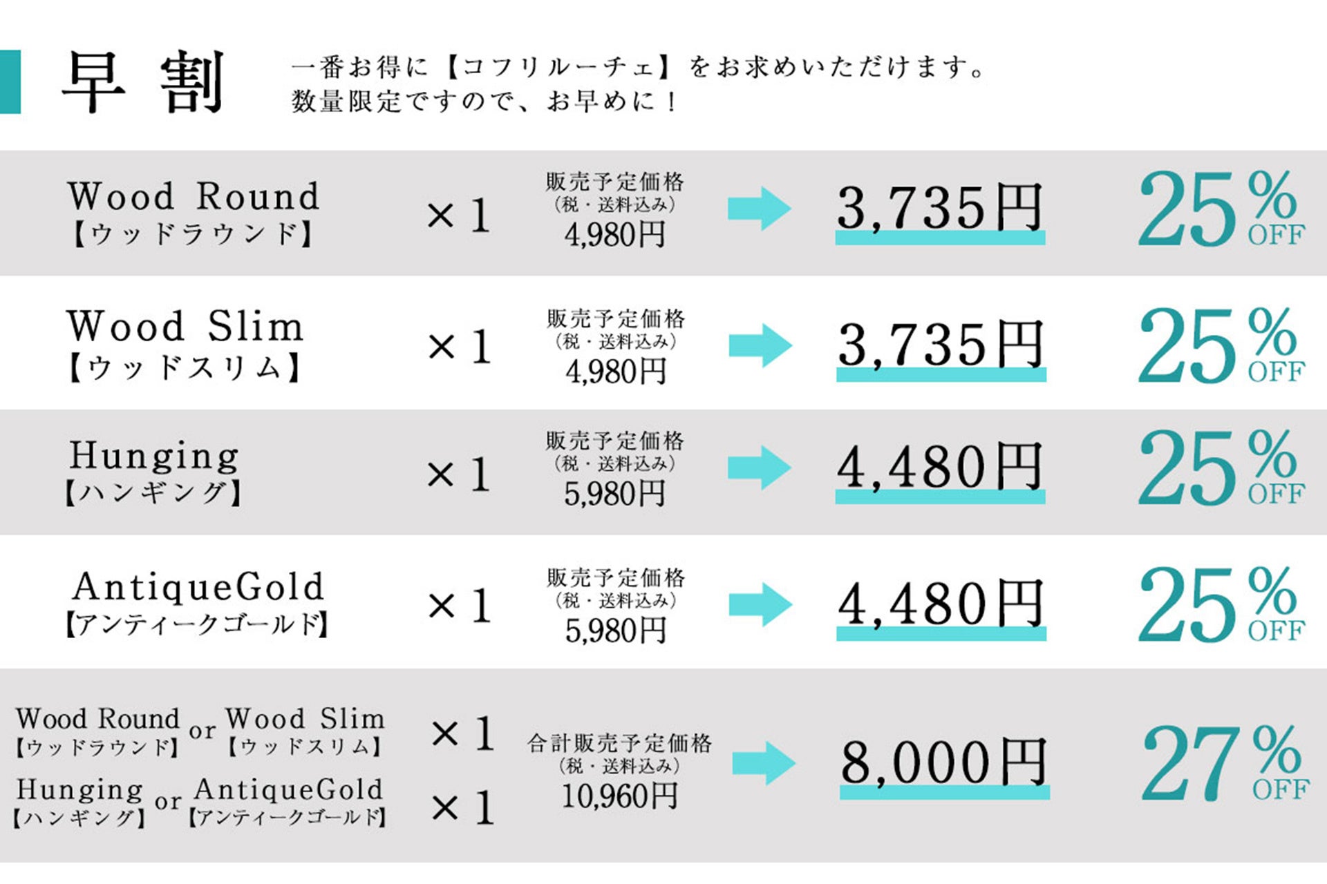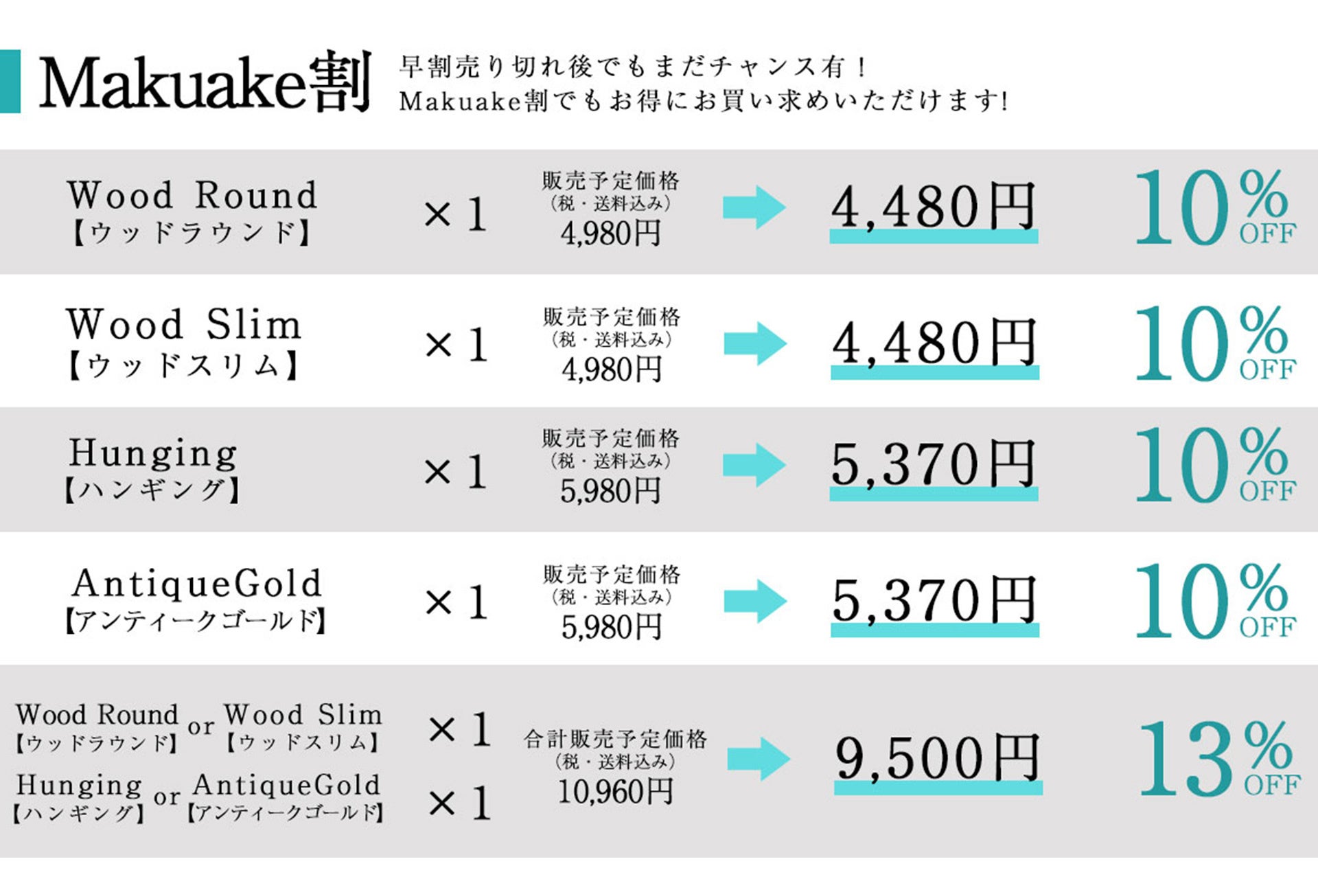 今回Makuakeにて、「早割」「マクアケ割」「セット割」をご用意しております。