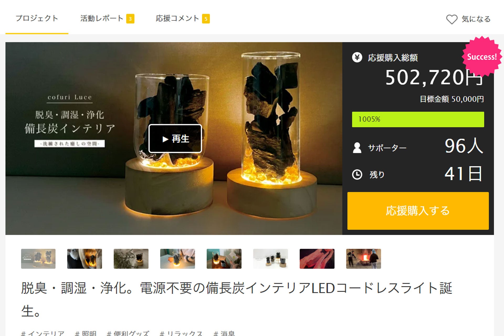 開始20分で目標達成!モニター募集に846名が殺到した《脱臭・調湿・浄化》電源不要の備長炭インテリアLEDコードレスライトがmakuakeで先行販売スタート!