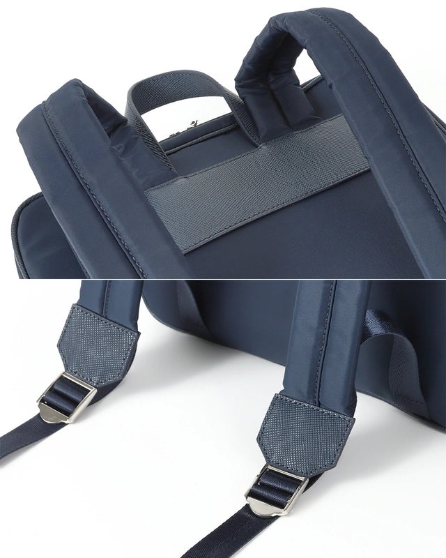 本体には落ち着いた光沢のナイロン素材を採用し、クッション性のあるポリエステル芯材を貼って強度を高めています。さらに玉縁や前ポケットなど、デザインのアクセントとして傷がつきにくい「牛本革サフィアーノレザー」を使用。