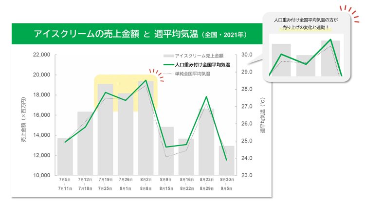 全国のアイスクリームの売上金額と週平均気温の推移(2021年7月~8月)単純な全国平均気温と人口重み付け全国平均気温の比較