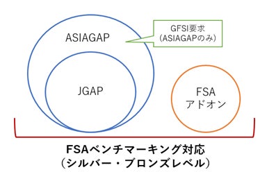 現行のJGAP、ASIAGAPによりベンチマーキングに対応するため、不足点についてはFSAへの対応に特化した管理点を付加するアドオン(付加)規格としました。対応のレベルは、レインフォレストアライアンス規格、GLOBALG.A.P.(アドオン規格であるGRASPとの同時取得)が実現しているものと同じシルバーレベルとなります。