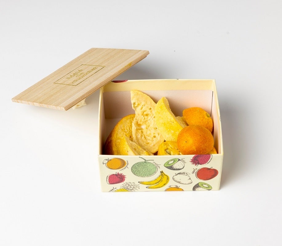 愛媛県産紅まどんな、宮崎県産の日向夏と金柑たまたまの3種が楽しめます。含浸チョコとしては珍しい柑橘類のしみこみショコラ3種の違いをお楽しみください。木製のフタが付いた可愛いボックスで、ちょっとしたプレゼントにもおすすめの一品です。