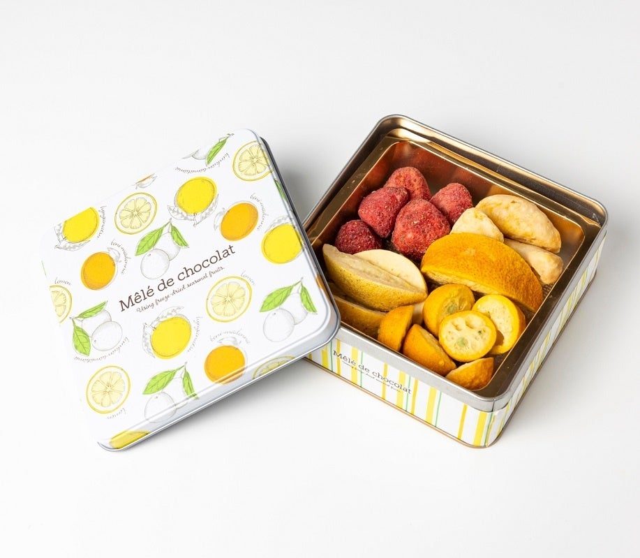 さわやかでかわいいフルーツのイラスト缶は柑橘商品の新しいバージョンで、ギフトや自分へのご褒美にも。