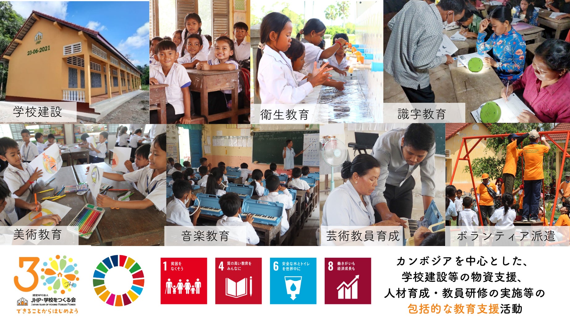 『1993年9月に設立されたJHPは、これまでカンボジアを中心として約375棟の学校校舎の建設、芸術教育支援活動、近年は成人を対象とした識字クラスを開講するなど、多岐の分野に渡る包括的な教育支援活動を行ってきました。