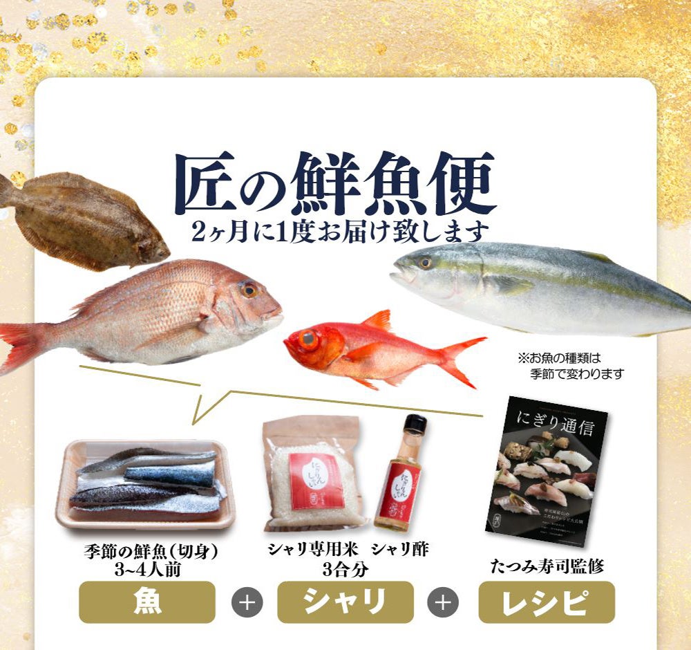 セット内容:季節の鮮魚(切り身、3〜5種類)、シャリ専用米、シャリ酢、レシピ
